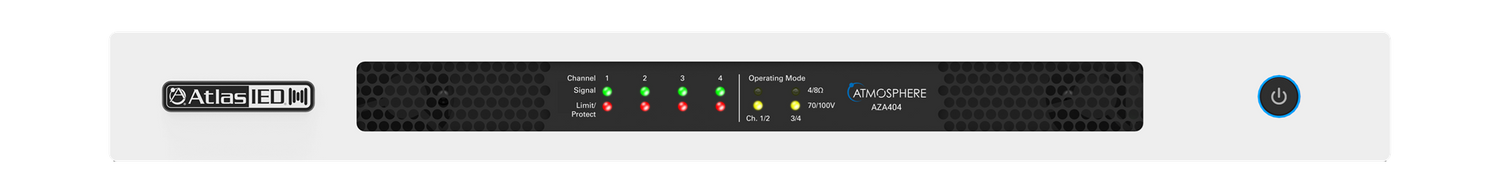 The AtlasIED Atmosphere AZA404 four-channel amplifier is designed to interface with the Atmosphere family of products, such as the AZM series of processors. The AZA amplifiers can be configured in pairs to deliver up to 100W per channel into both low and high impedance speaker loads (4Ω/8Ω/70V/100V).