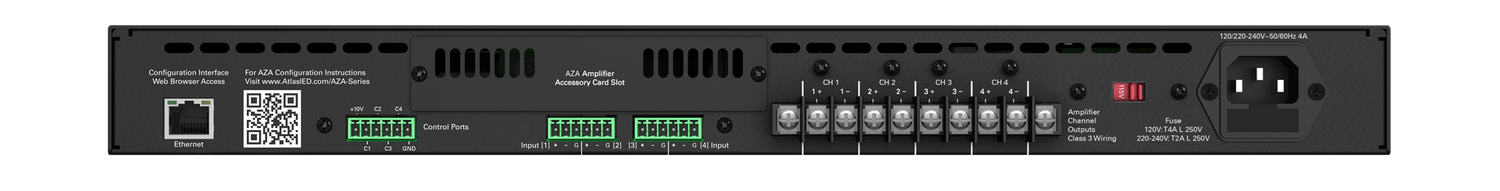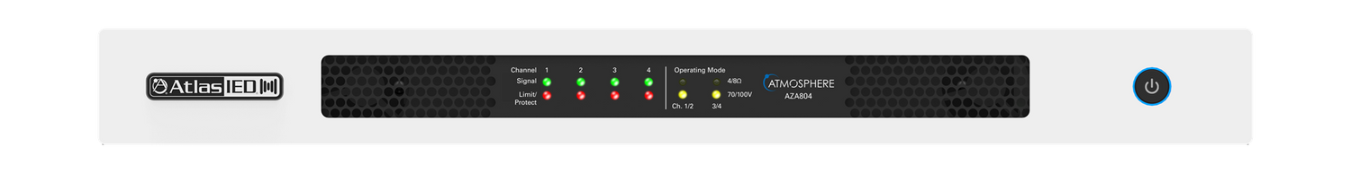 The AZA804 is ready to use out of the box in four-channel, 70V mode, with no additional configuration or network connectivity required, making them easily paired for use with AtlasIED Atmosphere signal processors.