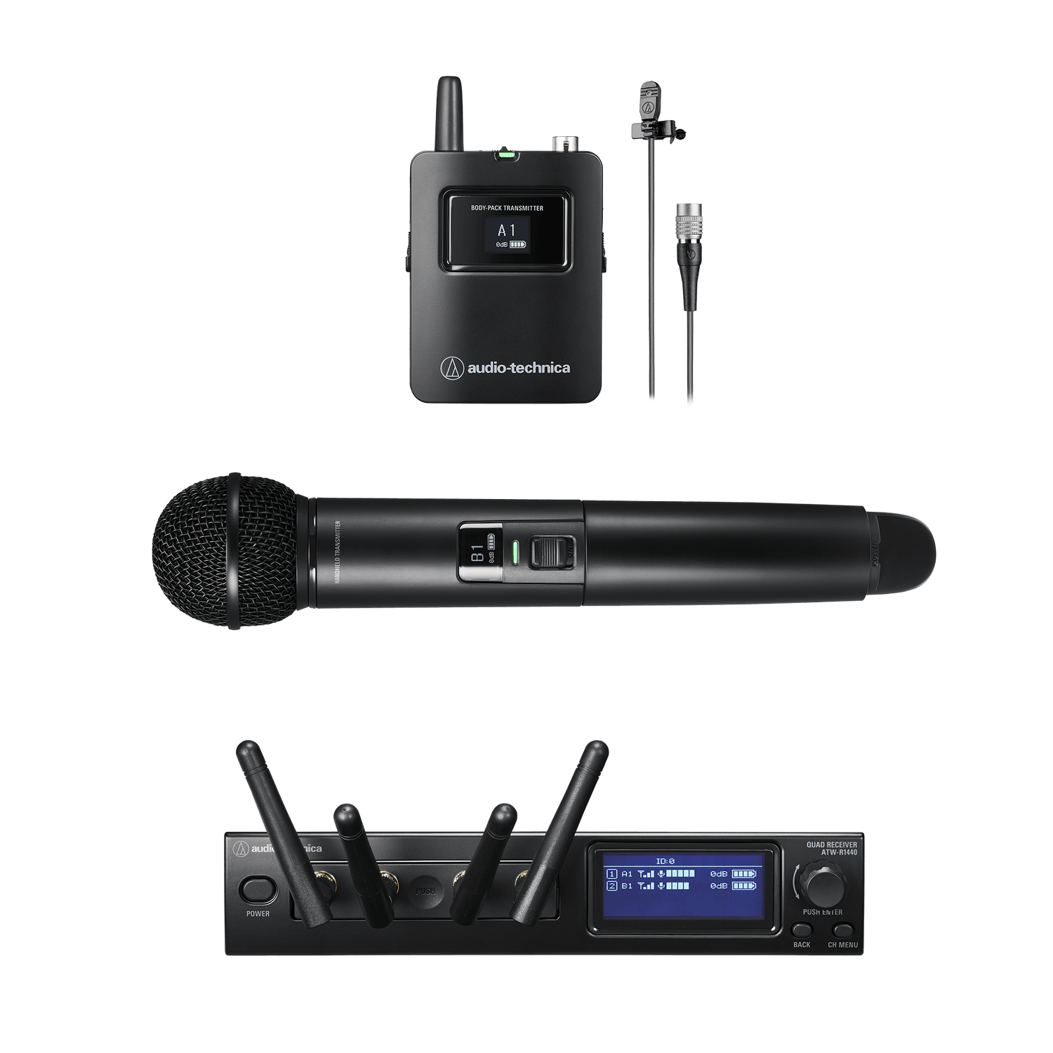 System 20 Digital Wireless System includes one ATW-R1440 4-channel receiver, one ATW-T1402 handheld microphone transmitter, one ATW-T1401 body-pack transmitter, and one MT830cW lavalier microphone.