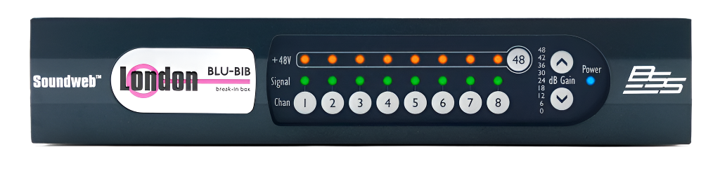 The BLU-BIB or “break-in box” offers 8 channels of analog audio input expansion via the Soundweb London high bandwidth, fault tolerant digital audio bus.