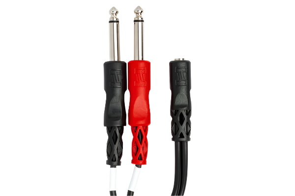 This cable is designed to split a stereo signal. Black- and red-coded mono phone plugs indicate left and right respectively.