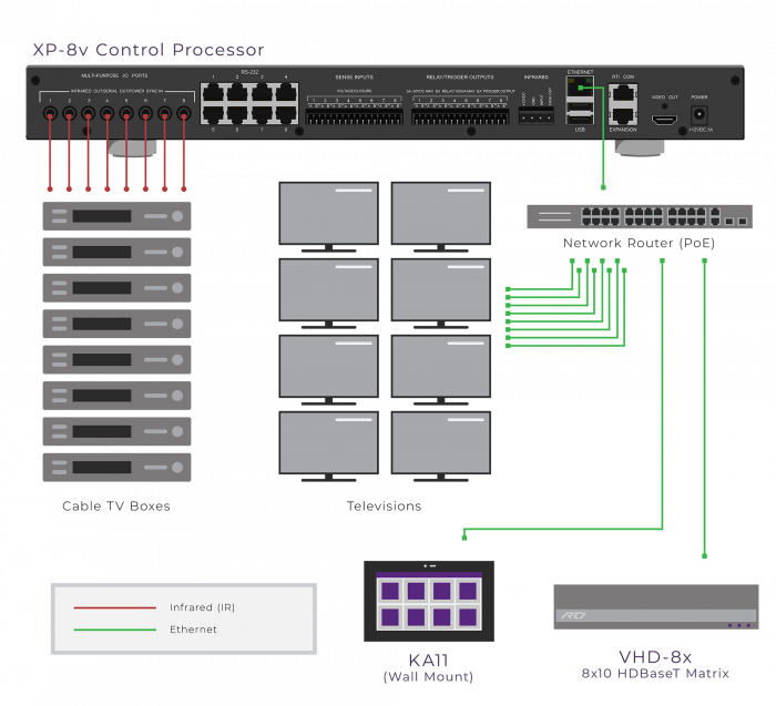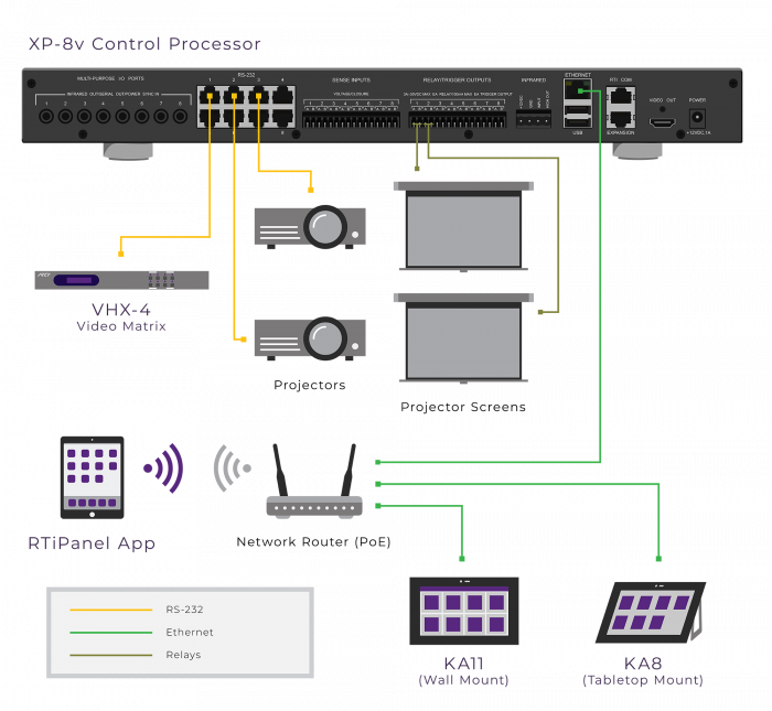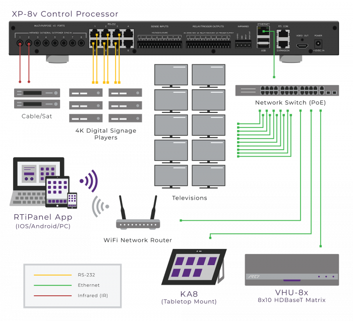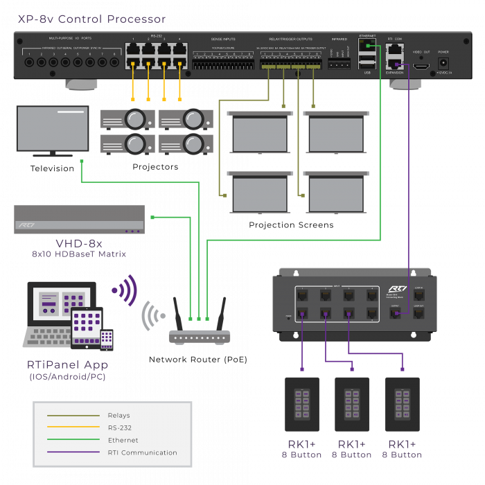 The XP-8v is RTI's most powerful system processor, able to control and automate the most advanced smart homes and smart offices. The processor leverages an extensive driver database to facilitate integration of third-party devices, such as A/V, lighting, shades, security and HVAC in homes and office buildings. The third generation of the popular XP-8 control processor, the accelerated XP-8v kicks control into high gear with even more processing power, additional memory and an HDMI output for an OSD (on-screen-display) interface. Increased performance combined with a real time/multitasking operating system, tremendous expandability and compatibility with any RTI controller or app, make the XP-8v the perfect solution for large-scale and complex projects.