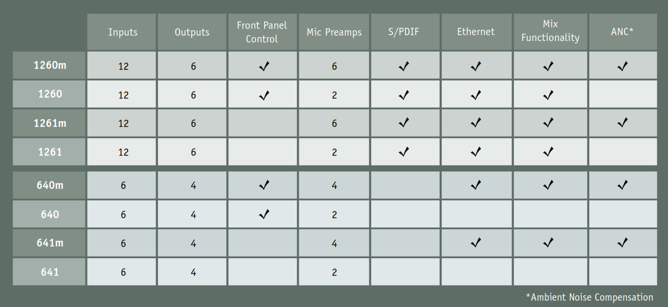The 1260m features a total of 12 inputs and six outputs. Inputs include six balanced mic/line switchable terminal block inputs, four mono-summed pairs of unbalanced RCA inputs and one S/PDIF input for up to two digital channels. Hardware-controlled microphone gain allows adjustment of microphone gain per channel.