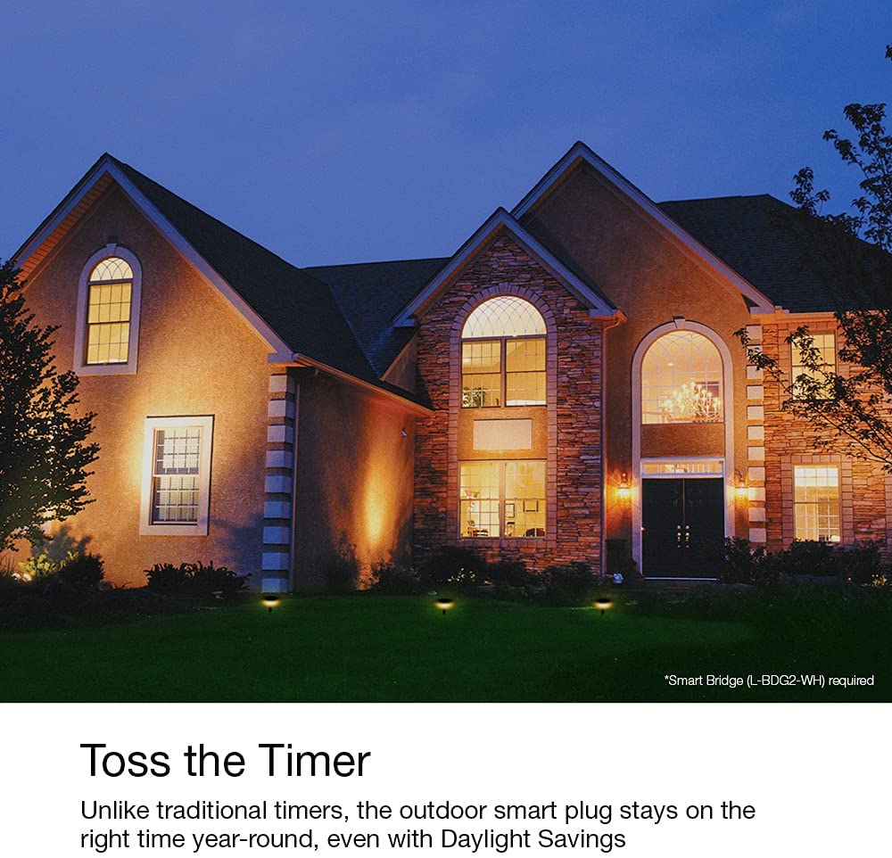 The Caséta Wireless Outdoor Smart Plug controls outdoor loads, both directly and remotely when paired with either Pico remote controls or a Lutron Caséta Smart Hub (formerly Smart Bridge), providing a system that delivers convenience and ease of installation.
