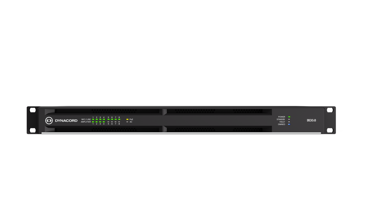 The IX30:8 is an 8-channel networked DSP amplifier with 3 kW total output power. Capable of driving Hi-Z or Lo-Z loads with powerTANK technology, the IX30:8 is ideal for a wide range of applications including sports venues, houses of worship, live performance spaces and hospitality.