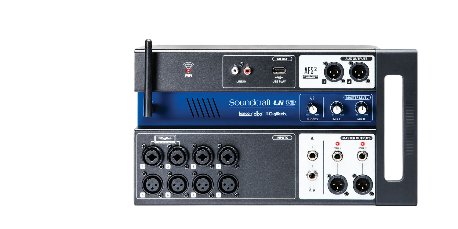 The Ui12 features four XLR combo mic/line inputs, four XLR mic inputs, two channels of Hi- Z/instrument inputs, as well as a stereo RCA line input. A 2-channel USB media player is included, along with two balanced XLR Aux outputs, two quarter-inch headphone outputs with level control, plus balanced stereo XLR and quarter-inch main outputs. Two-channel USB audio playback is compatible with MP3, WAV and AIFF formats.