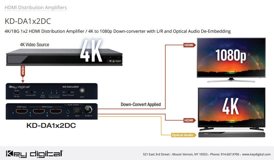 KD-DA1x2DC is a 4K 18G HDMI Distribution Amplifier with 4K to 1080p resolution down conversion option to enable a single HDMI video source to be displayed on multiple video displays, regardless of 4K or 1080p resolution support.