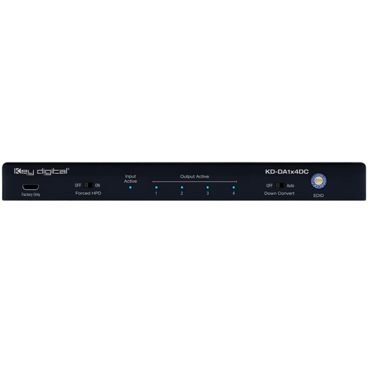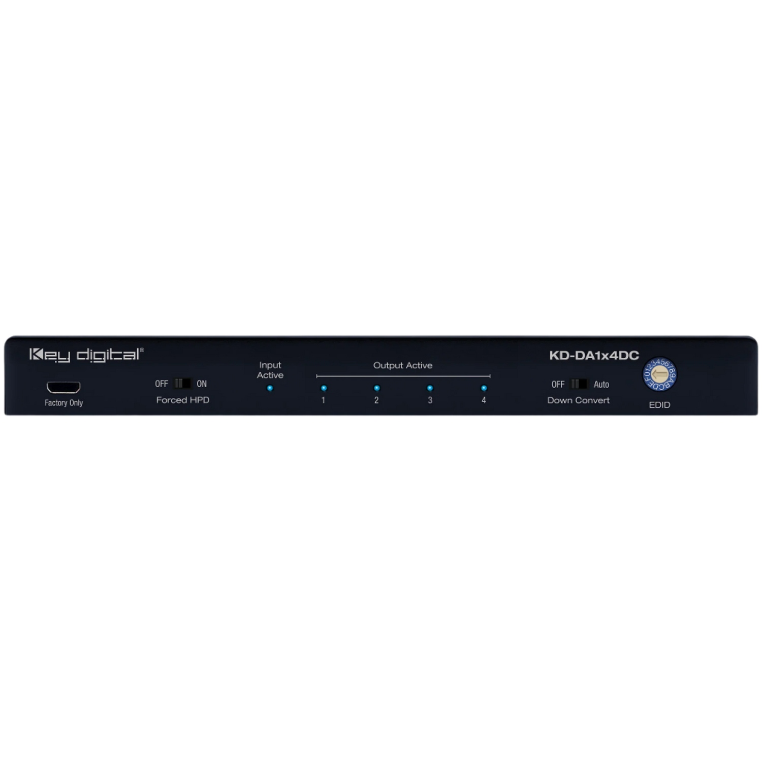 KD-DA1x4DC is a 4K 18G HDMI Distribution Amplifier with 4K to 1080p resolution down conversion option to enable a single HDMI video source to be displayed on multiple video displays, regardless of 4K or 1080p resolution support.