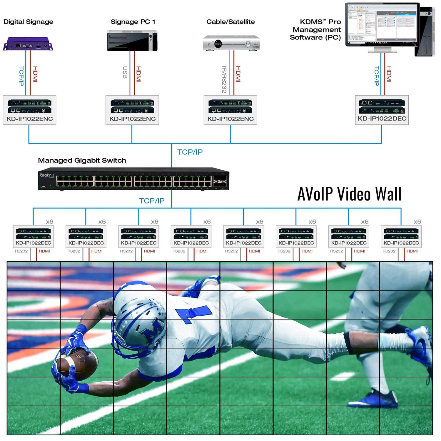 Key Digital’s 4K AV over IP system may be scaled to fit any installation need. Add an Encoder per video source or Decoder per video display and use a verified network switch as the central point of this HDMI AV routing and distribution system. The Key Digital 4K AV over IP system is completely integrated, with Encoder and Decoder product options including video wall, mosaic video wall, independent audio and video routing, control, audio pre-amp, app-ready user interface capabilities, and more.