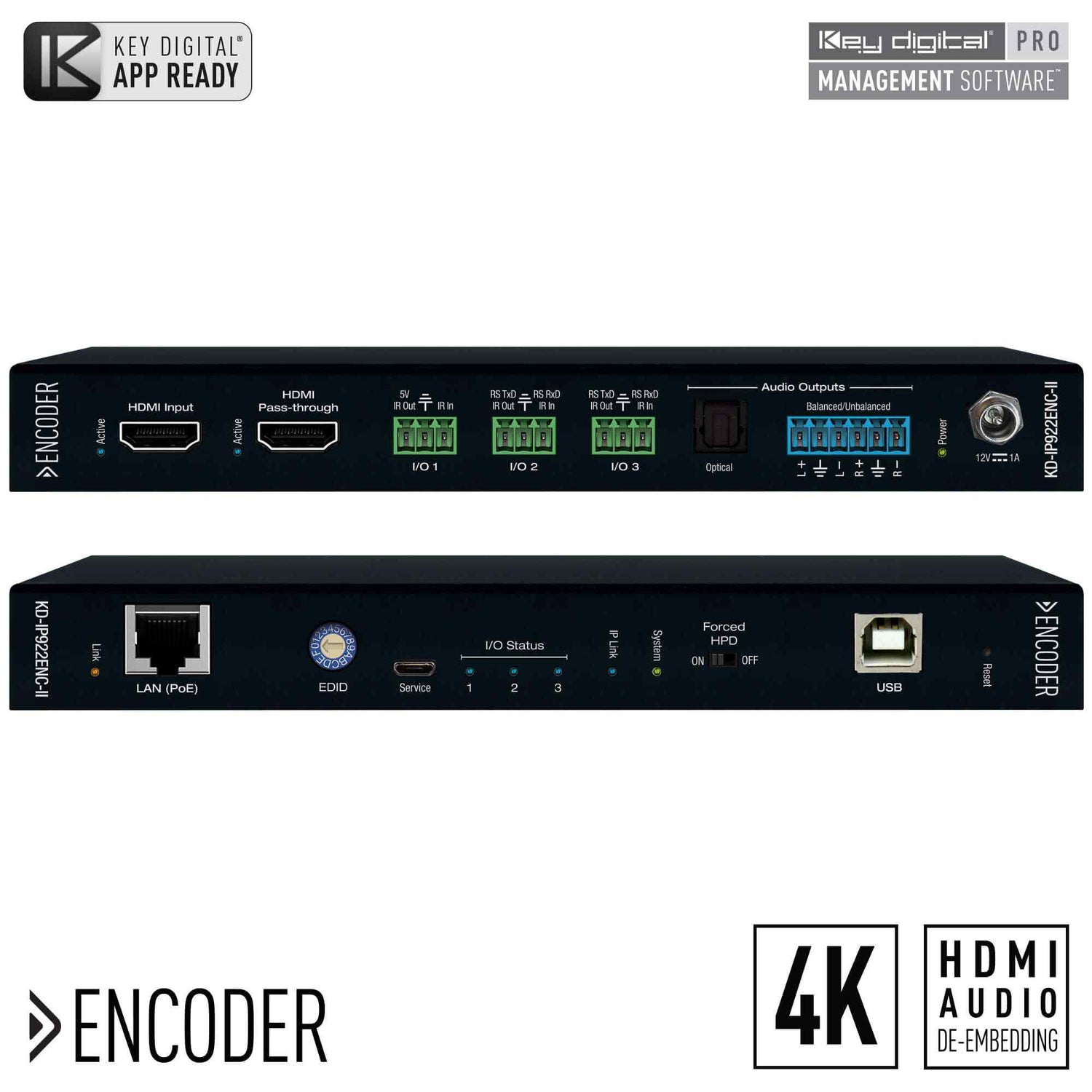 The Key Digital 4K AV over IP system meets all integration needs, with Encoder and Decoder features including a video wall, IR & RS-232 control, audio pre-amp, app-ready user interface capabilities, and more.