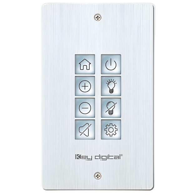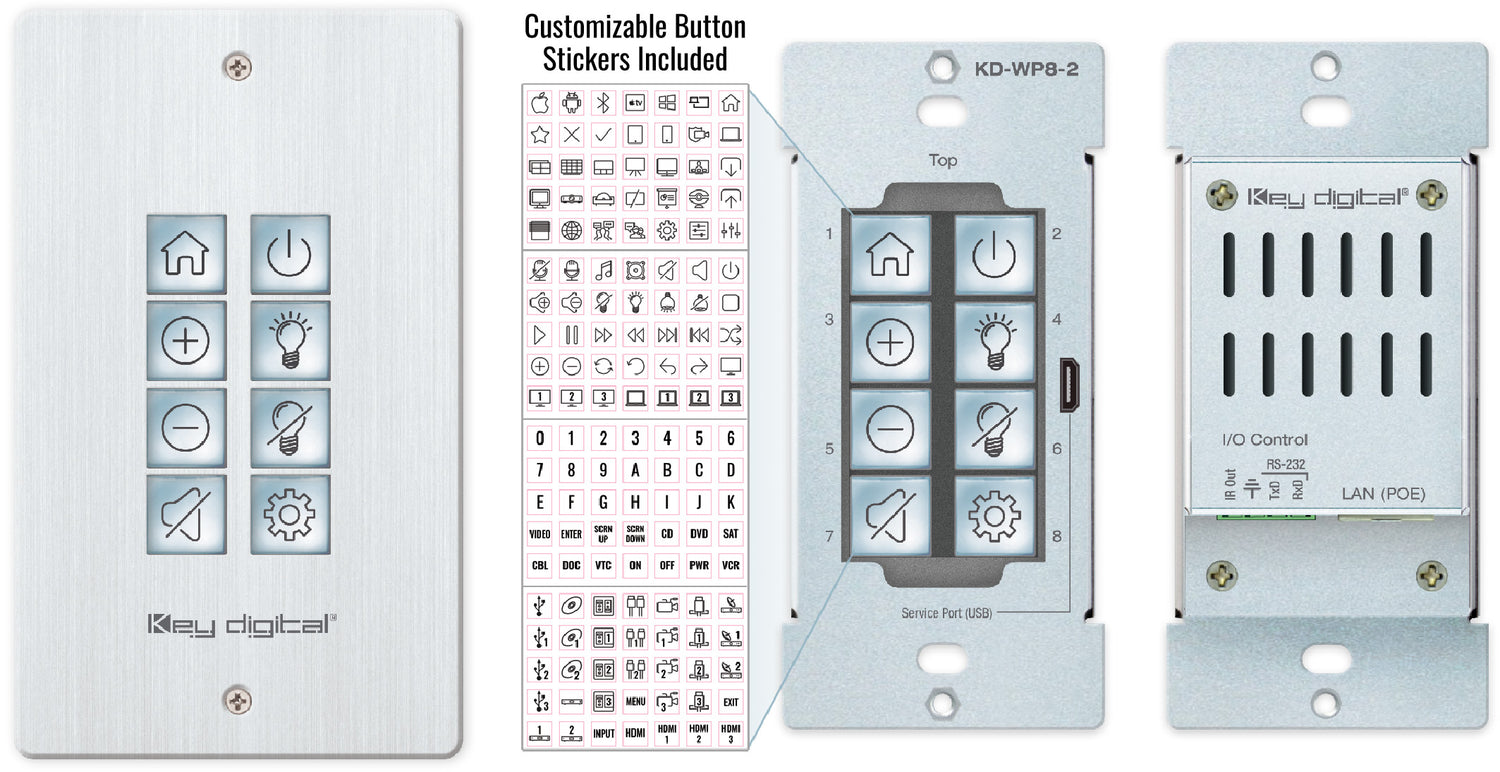 The Key Digital® KD-WP8-3 is an eight-button control keypad. It fits into a single-gang wall box and is PoE-powered.