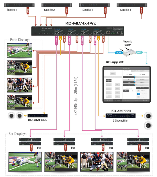 The KD-MLV4x4Pro is a matrix switcher device with multi-view video processing tailored for a variety of environments, from sports and gaming caves to corporate AV setups.