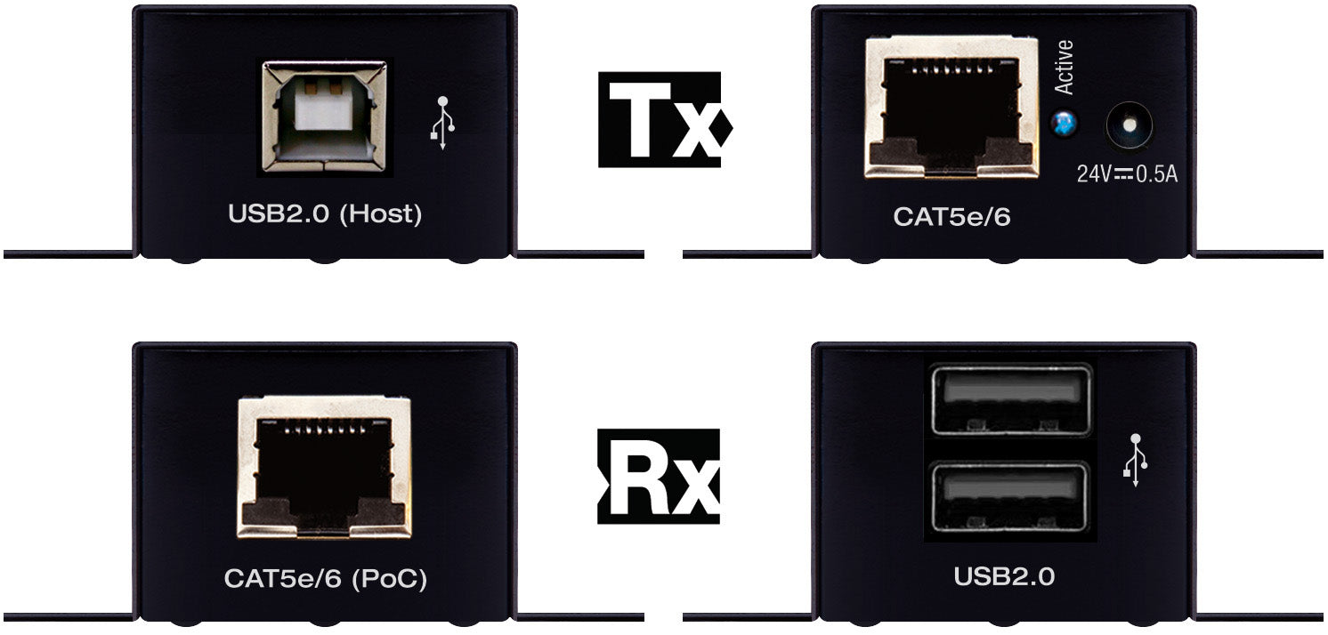 KD-XUSB2 is a USB 2.0 transmitter + receiver extender kit that has been optimized for use with high bandwidth USB1.1-2.0 devices, making it ideal in conference rooms and classrooms as well as in business offices and connected homes. KD-XUSB2 enables host laptops, computers, smart TVs or appliances to connect with devices such as web cams, keyboard and mouse, hard drives, printers and scanners, USB microphones, touchscreen displays, conferencing DSPs, and more. KD-XUSB2 extends USB signals up to 50m / 164ft via single CAT5e/6 cable, and only the transmitter needs a power connection. The transmitter features one USB-B connection and the receiver has two USB-A ports which may also connect to a USB hub for up to 15 supported devices.