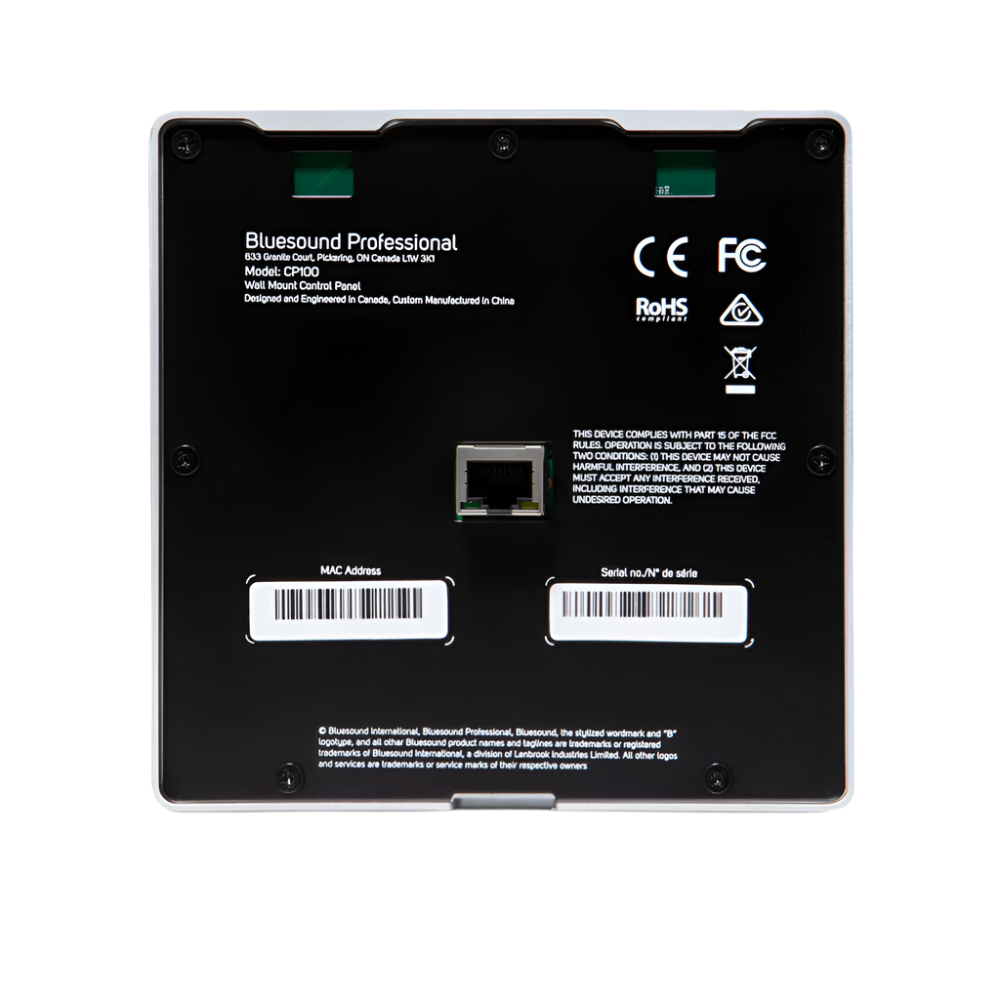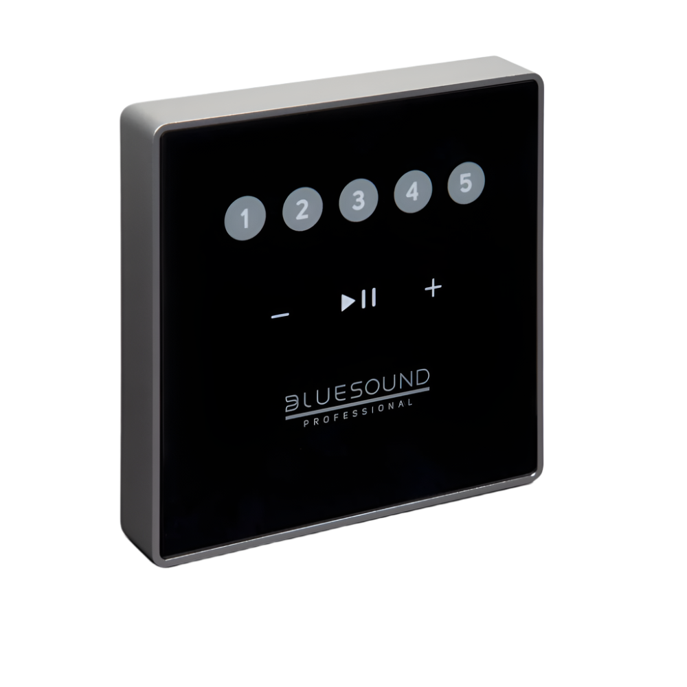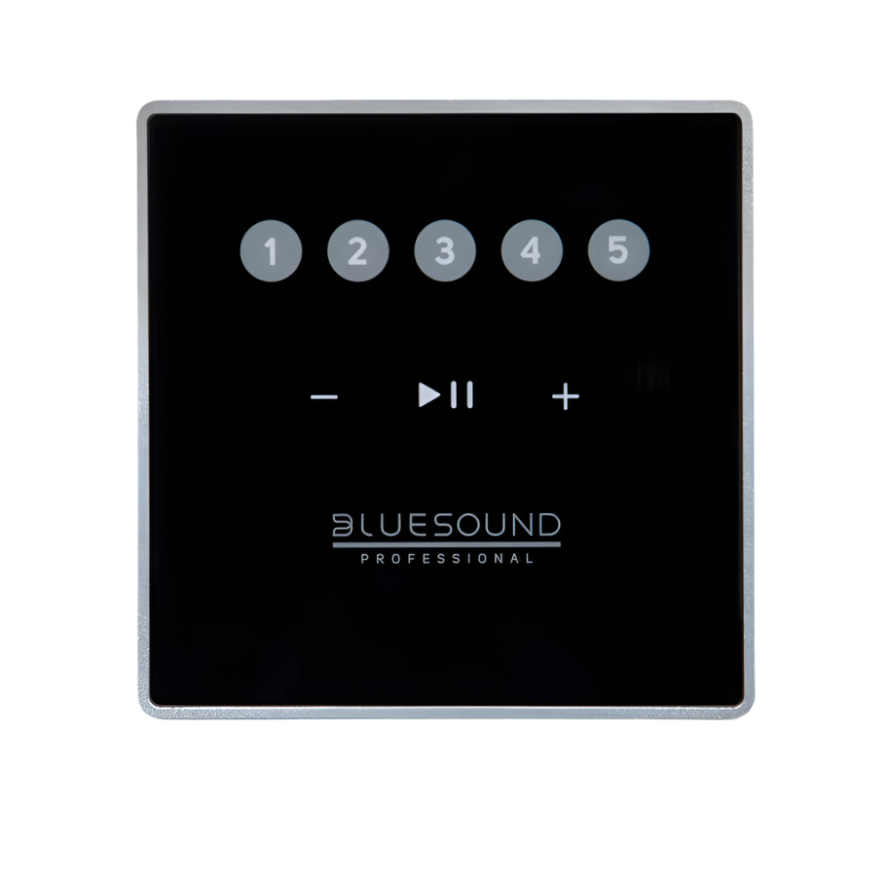 The Bluesound Professional CP100 is a low profile wall-mount control panel for all Bluesound Professional players. It features sleek design with a glass control panel with illuminated touch sensitive controls. It is possible to recall presets, pause music/mute and adjust volume in the zone that the panel is controlling. The CP100 is designed to fit flush to the wall or mounted in a large variety of international back-boxes for ease of installation. The control panel controls illuminate as needed, and the control can be locked to protect against unintended or unauthorized use.