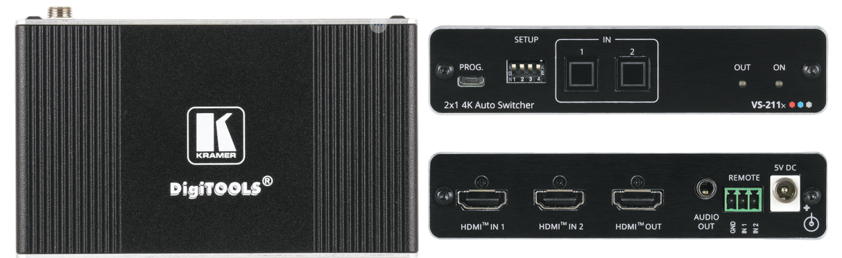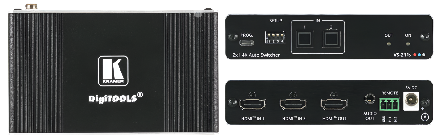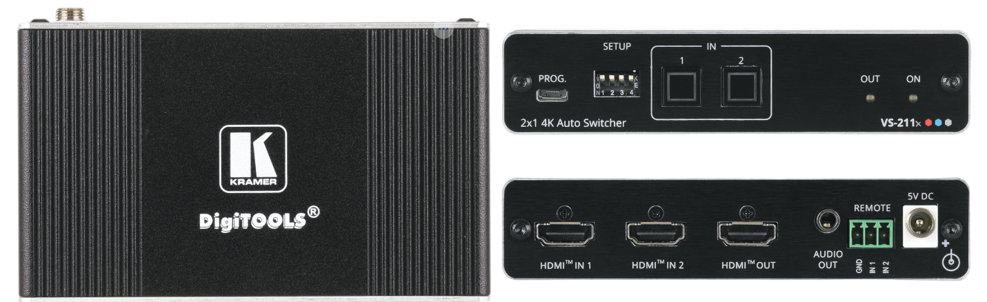 VS−211X is a high−performance 2x1 automatic switcher for 4K HDR, HDMI video signals. Offering priority and last−connected switching options, it automatically switches according to the selected switching scheme based on active video signal detection.