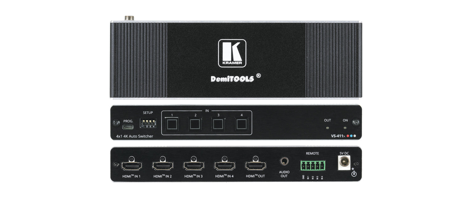 VS−411X is a high−performance 4x1 automatic switcher for 4K HDR, HDMI video signals. Offering priority and last−connected switching options, it automatically switches according to the selected switching scheme based on active video signal detection.