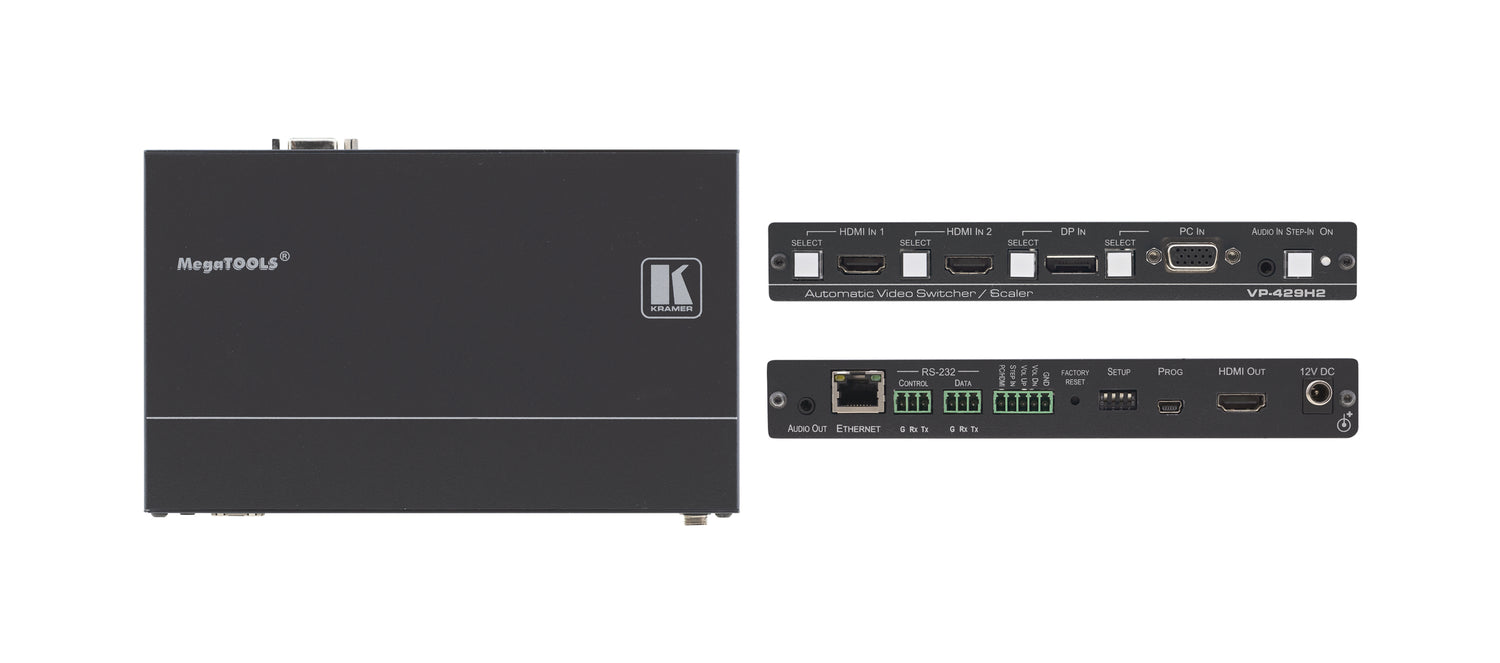 VP−429H2 is a 4K@60Hz (4:4:4) scaler / switcher tool for HDMI, DisplayPort, VGA, and unbalanced audio signals. The unit scales the signal and outputs it on HDMI. Step−In functionality provides easy plug−and−play collaboration when connected to a switcher that supports Step−in over HDMI. It also features convenient RS−232 control of monitor or projector activation and supports Ethernet, contact closure switches and RS−232 control.