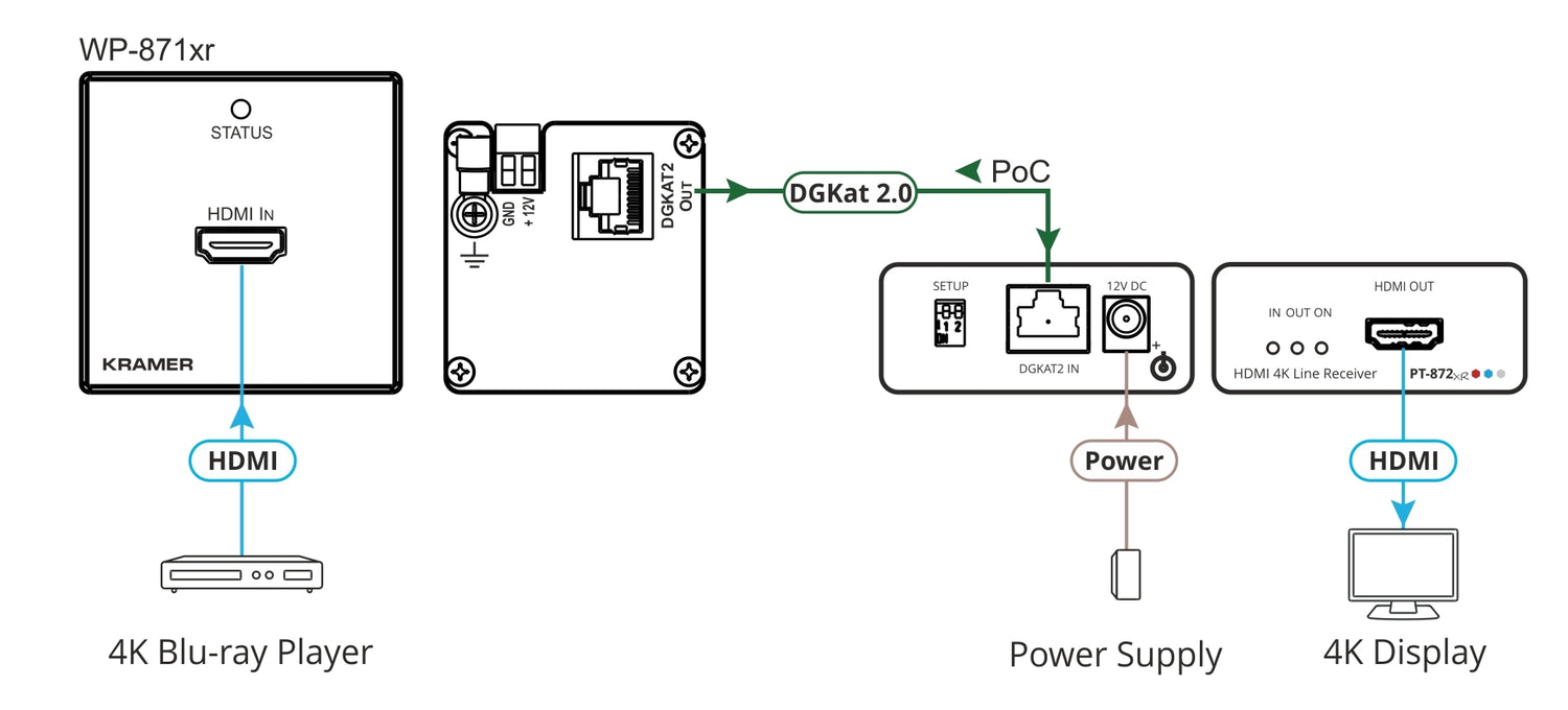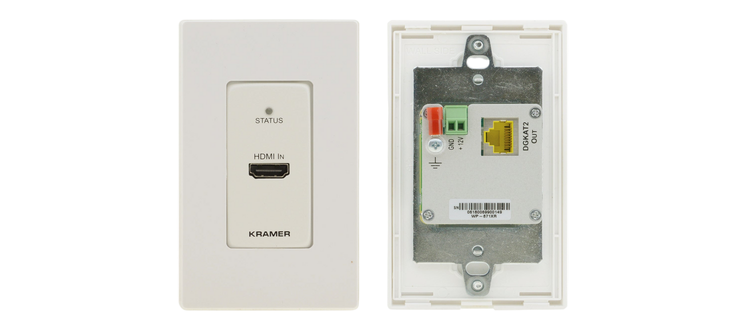 WP−871xr is a high−performance, long−reach DGKat™ 2.0 wall−plate transmitter for 4K@60Hz (4:4:4) HDR HDMI and HDCP 2.2 signals and power over twisted pair. It converts the HDMI input signal into a DGKat™ 2.0 signal and transmits it to a compatible receiver. WP−871xr extends the signal to up to 60m (200ft) at 4K@60Hz (4:4:4) resolution and up to 70m (230ft) at 4K@30Hz (4:4:4) 24bpp resolution over Kramer shielded cables. This wall−plate is powered through PoC (Power over Copper) over the twisted pair cable.