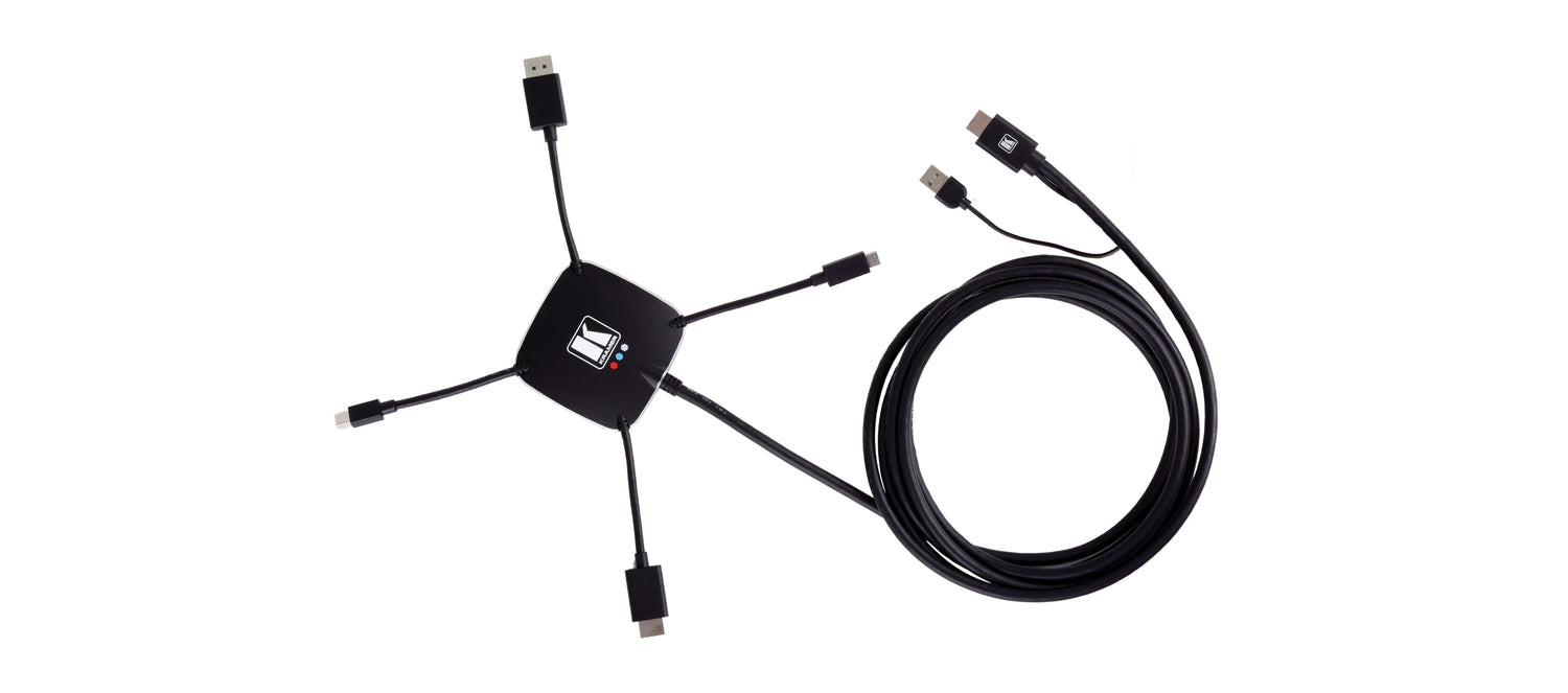 K−SPIDER is an active multi−format male input to HDMI male output adapter that enables you to connect one HDMI, DisplayPort, mini-DisplayPort, or USB Type−C source to an HDMI acceptor.