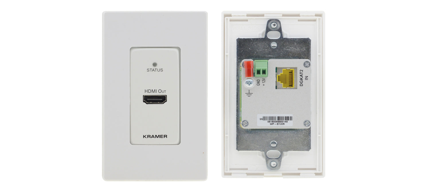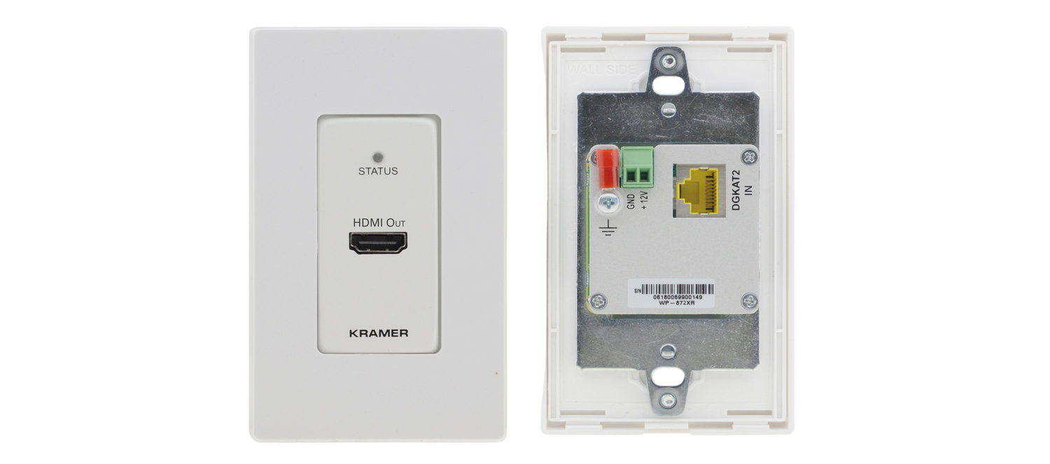 WP−872xr is a high−performance, long−reach DGKat™ 2.0 wall−plate receiver for 4K@60Hz (4:4:4) HDR, HDMI, HDCP 2.2 signals and power over twisted pair. It converts the transmitted DGKat™ 2.0 signal into an HDMI signal. WP−872xr extends the signal to up to 60m (200ft) at 4K@60Hz (4:4:4) resolution and up to 70m (230ft) at 4K@30Hz (4:4:4) 24bpp resolution over Kramer shielded cables. This wall−plate can either provide or accept power through PoC (Power over Copper) over the twisted pair cable.