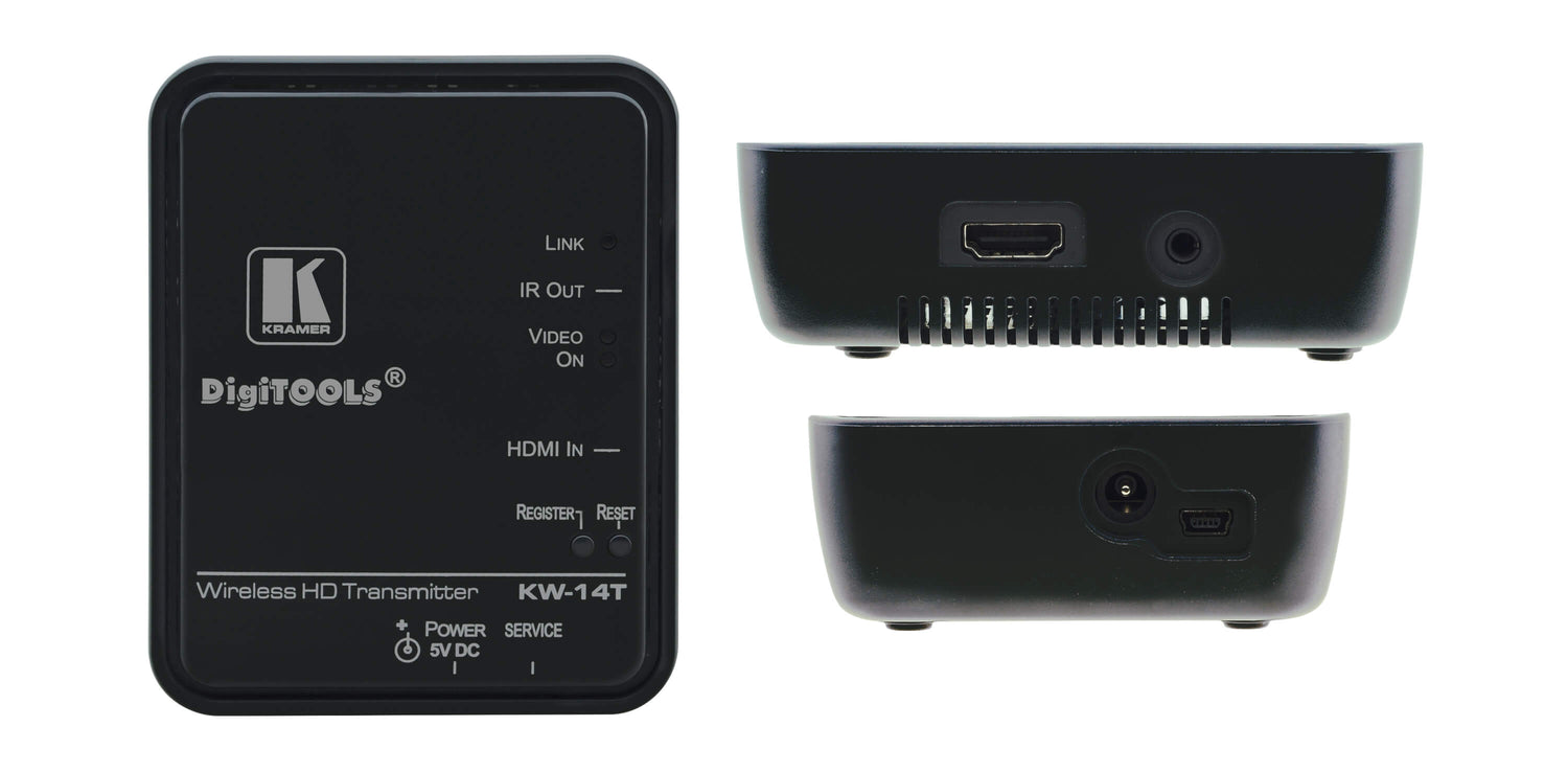 The KW−14T and KW−14R are a high−definition, wireless, HDMI transmitter/receiver pair for indoor use. Up to four KW−14R receivers can receive from one KW−14T transmitter and up to three KW−14T transmitters can be paired with one KW−14R receiver. The KW−14T and KW−14R pair comes pre−associated.