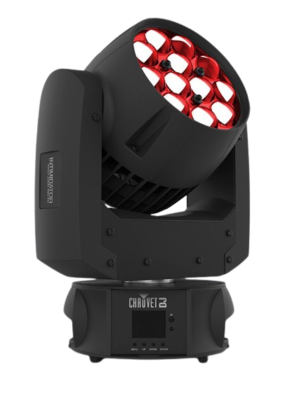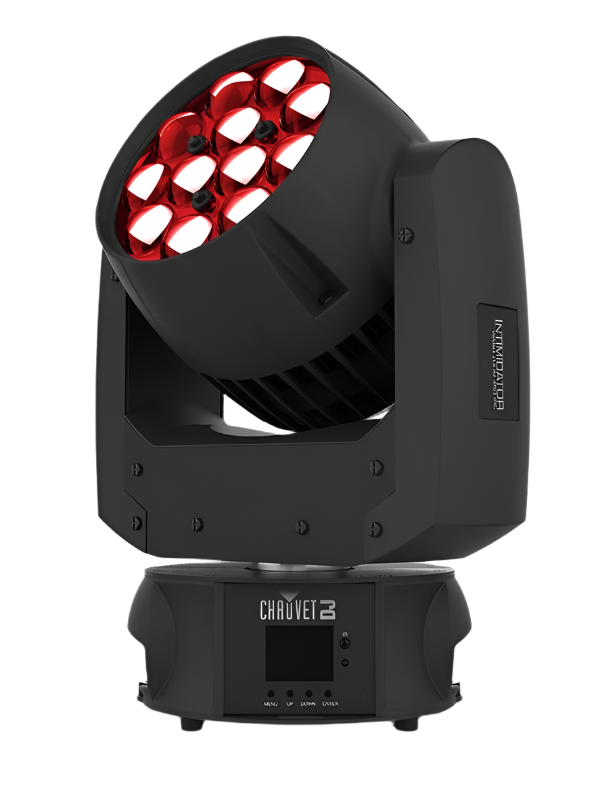 Intimidator Wash Zoom 450 IRC is a powerful moving head wash fitted with twelve 20 W quad-color RGBW LEDs and a motorized zoom for short-throw or longthrow applications. Other convenient features include a Totem mode that keeps beams aimed at the dance floor and eye-catching auto programs with zone control. Wireless (non-DMX control is possible using the optional IRC-6 remote. Up to four fixtures can be linked to create synchronized shows in automated, sound and master/slave modes.