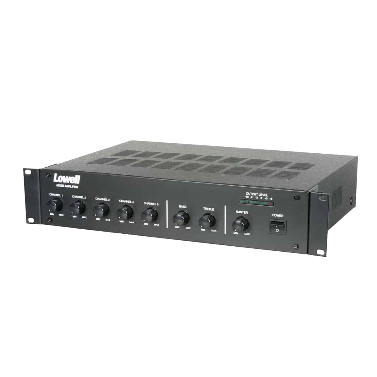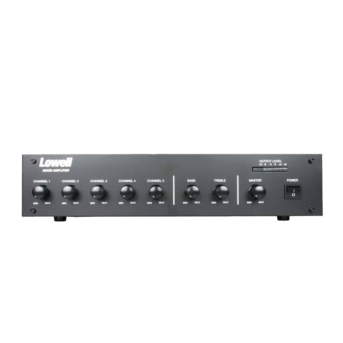 Mixer with 250W amplifier is powered via switchable 115 or 230 VAC @ 50/60Hz or 24VDC. Features five channel volume controls, treble and bass controls, master volume control, main power switch, and LED display bank for output level.