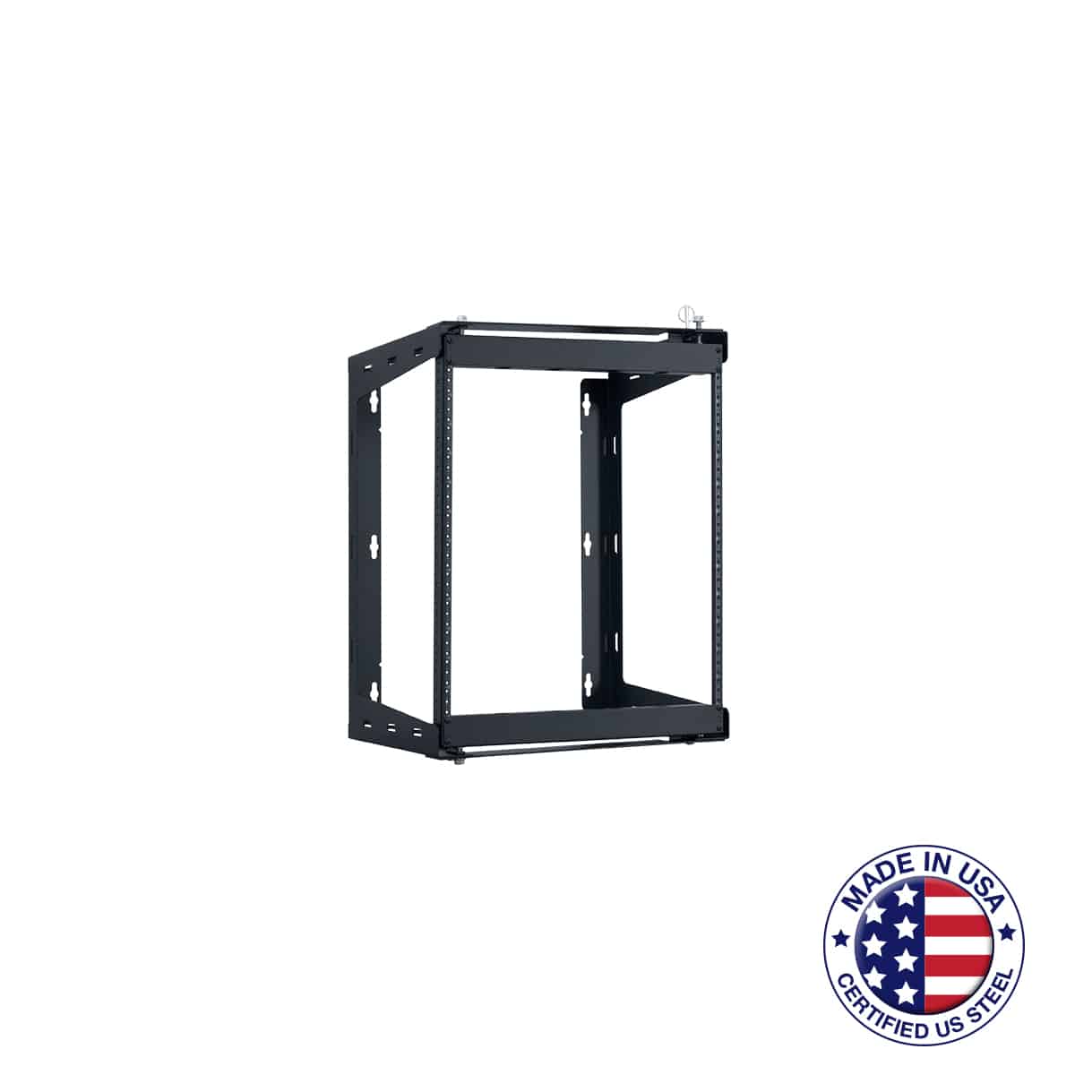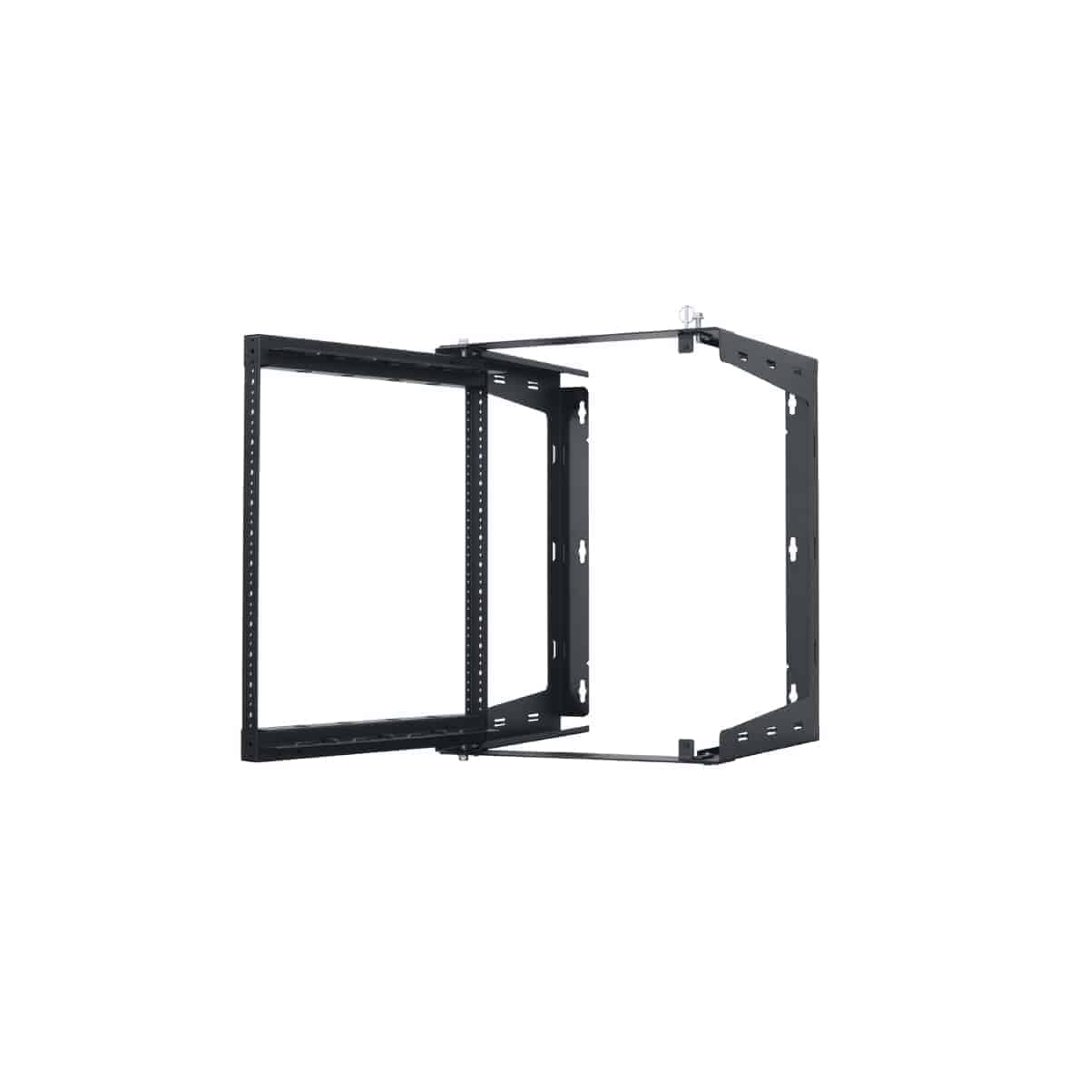 Open frame wall rack is a cost-effective solution for 19-inch network and security equipment kept in telecommunications rooms and similar secure areas. The versatile, swing-open frame allows easy access to equipment and cables. Steel with black powder epoxy finish.