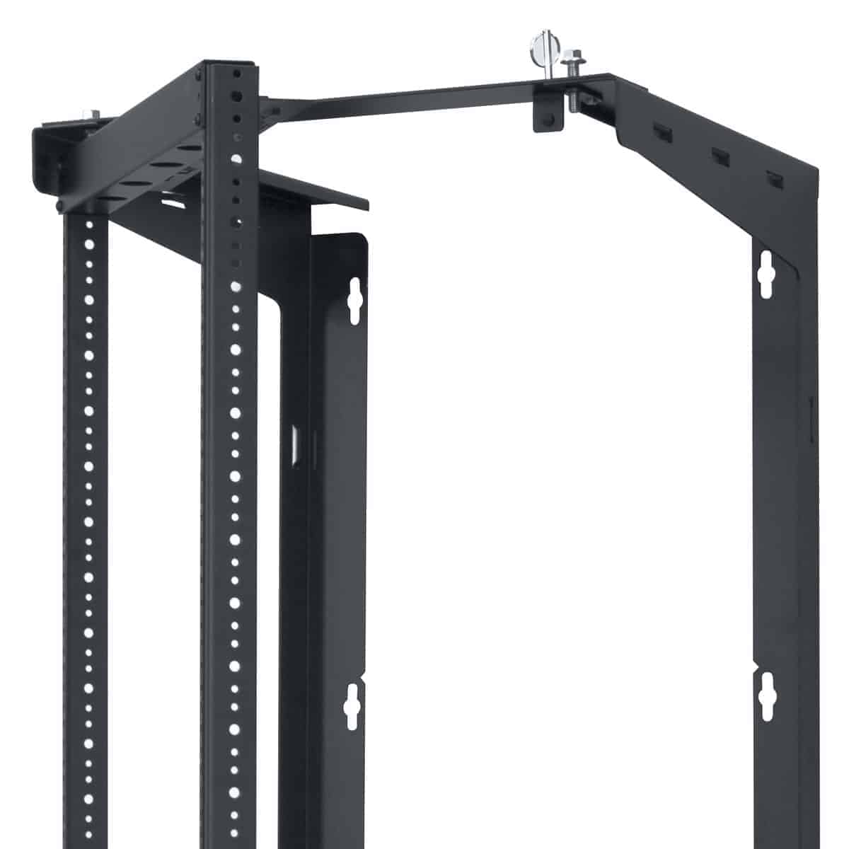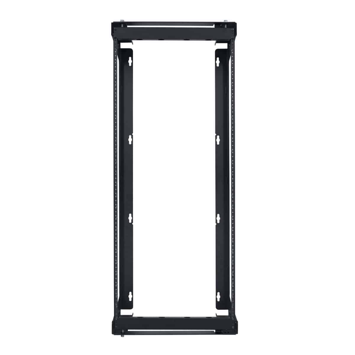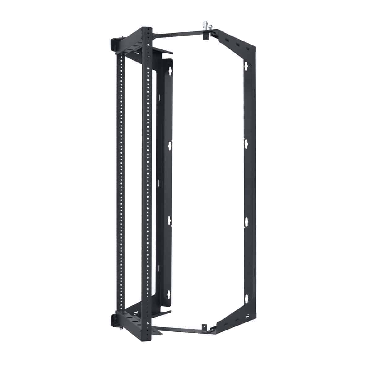 Open frame wall rack is a cost-effective solution for 19" network and security equipment kept in telecommunications rooms and similar secure areas. The versatile, swing-open frame allows easy access to equipment and cables. Steel with black powder epoxy finish.