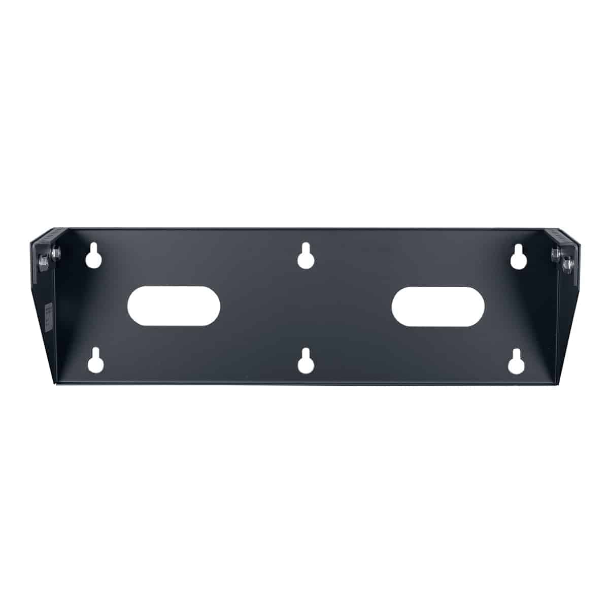 Quintessential space saving solution mounts to a wall or desk to hold equipment vertically or horizontally. Accommodates a variety of equipment depths. Two can be used together for 4-point mounting.