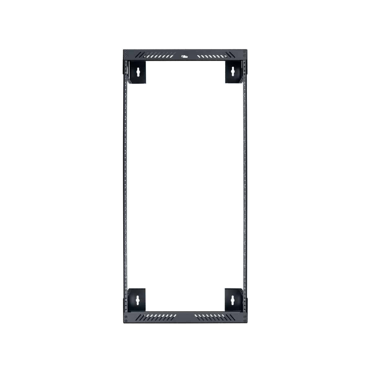 Slim open-frame wall rack mounts 19-inch equipment to wall or backboard. Top and base are heavy gauge steel that can be mounted on 16-inch centers to form a stable platform for patch panels, routers, switches, telecommunications, or computer equipment. Steel with black powder epoxy finish. Ships unassembled.