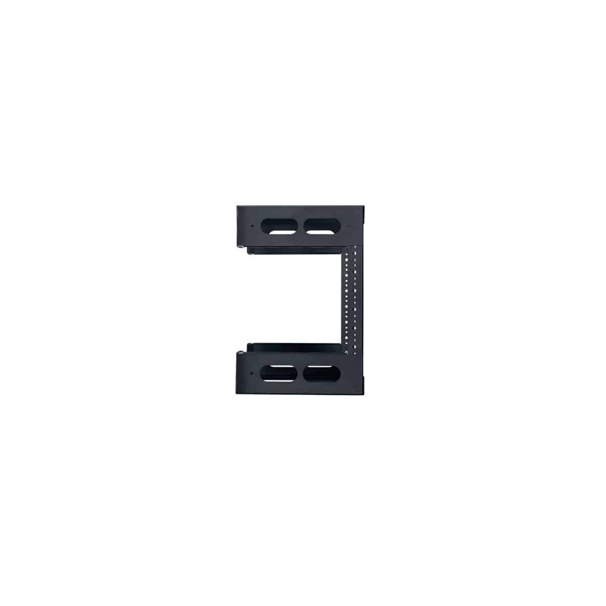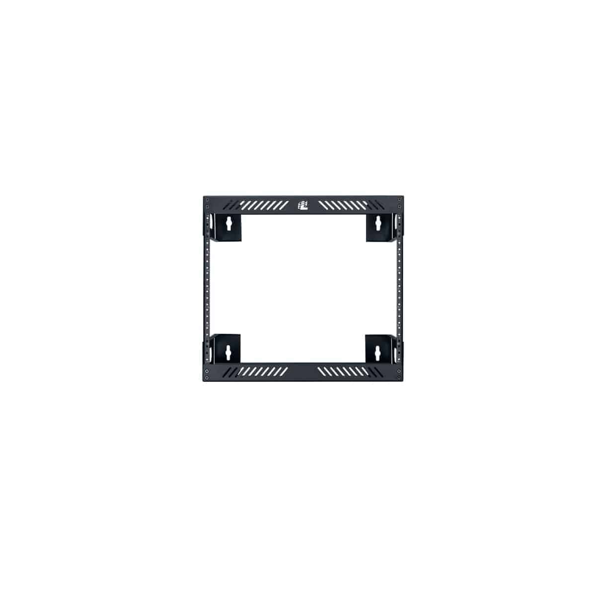 Slim open-frame wall rack mounts 19" equipment to wall or backboard. Top and base are heavy gauge steel that can be mounted on 16" centers to form a stable platform for patch panels, routers, switches, telecommunications, or computer equipment. Steel with black powder epoxy finish. Ships unassembled.