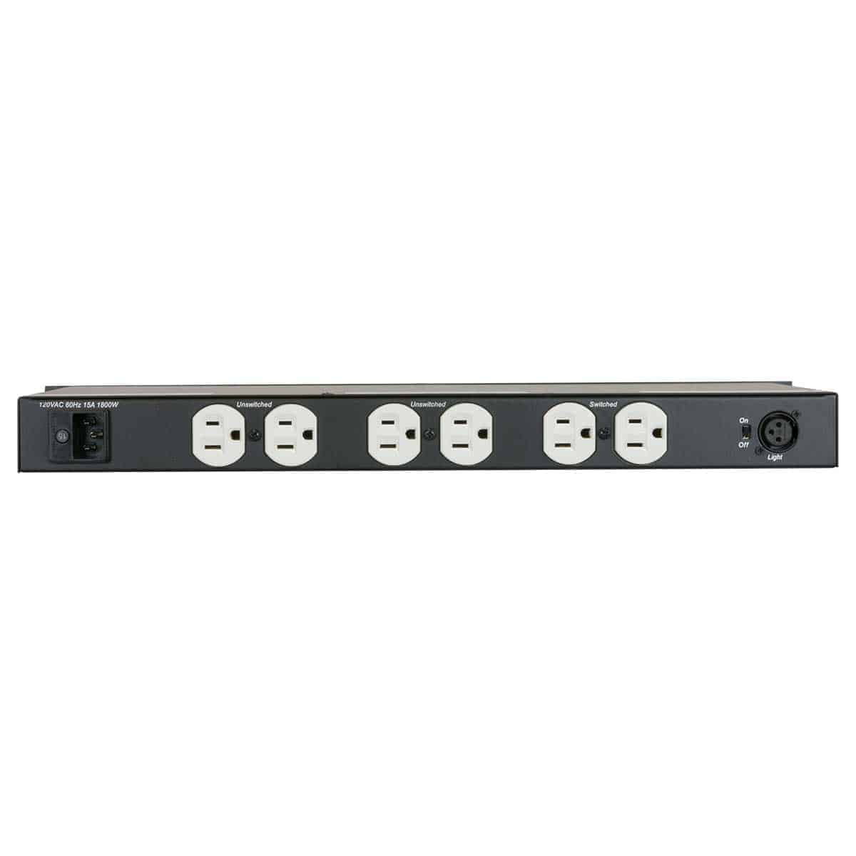 Power distribution panel features seven (7) NEMA 5-15R receptacles. One of the duplex receptacles is controlled by the front lighted on/off switch, while the other receptacles are always on (including the front convenience receptacle). Two front XLR connectors are controlled by a dimmer. One rear XLR connector is controlled by a separate on/off switch. The panel includes two gooseneck lights (an optional third light can be ordered separately). Includes 9-ft. detachable cord with NEMA 5-15P plug.