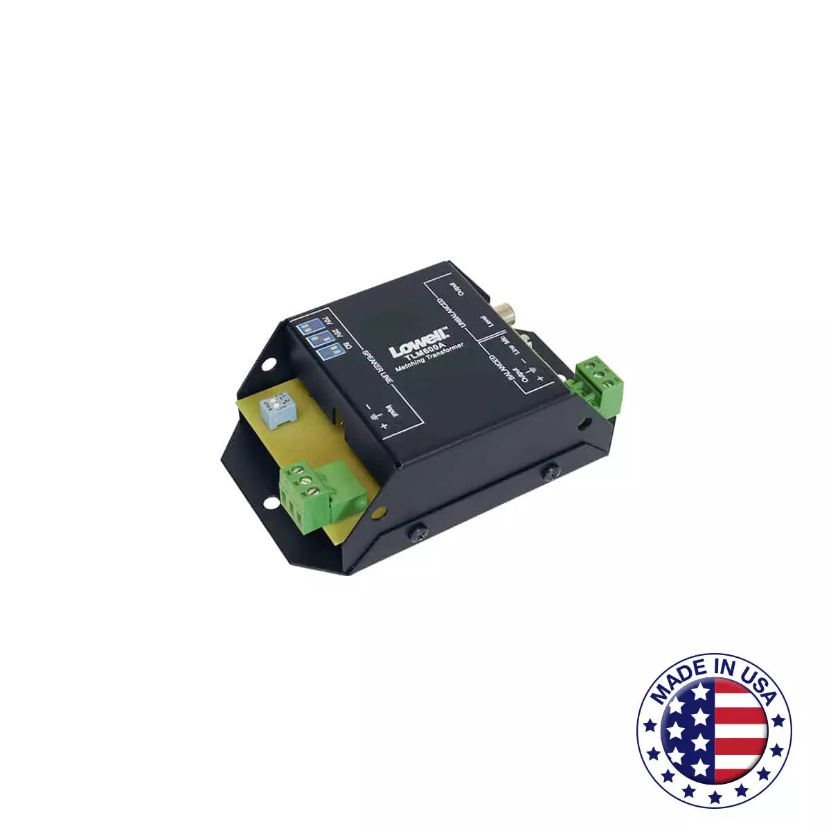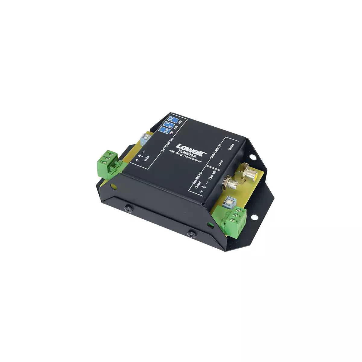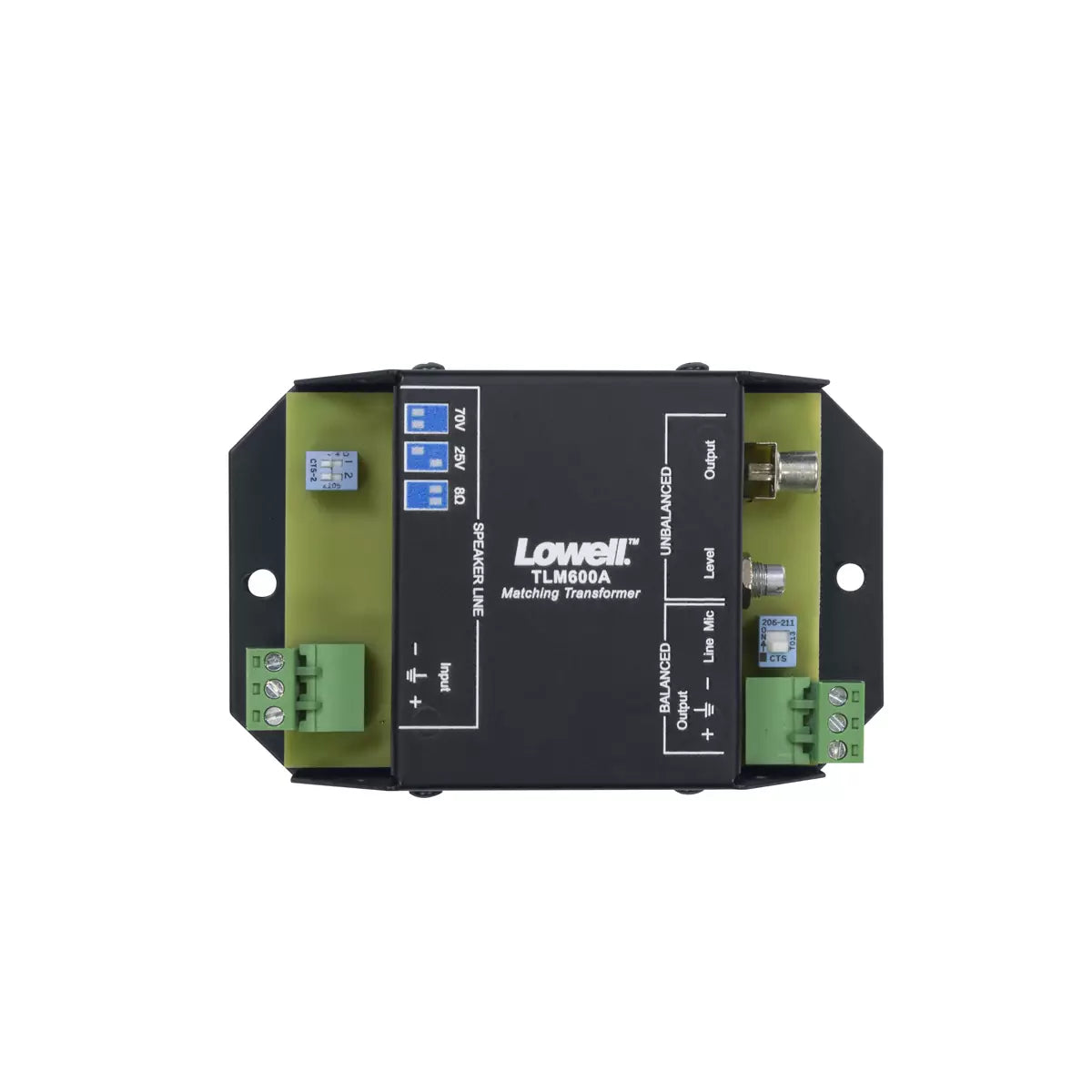 The streamlined impedance matching transformer is designed to simplify wiring for 70V, 25V or 8ohm speaker level conversion to amplifier input. Input pads (70V, 25V) can be added to the circuit simply by selecting positions on two dip switches (no jumpers needed). A 100Kohm potentiometer and RCA connector are also permanently wired into the circuit (no jumpers needed). NOTE: This simple design does not allow the transformer to be accessed directly via terminal strip connections due to pad resistors that are permanently wired in series with transformer wiring. High impedance to low impedance conversion is still possible through the transformer; however, this device is not recommended for exact 25Kohm to 600ohm impedance matching.