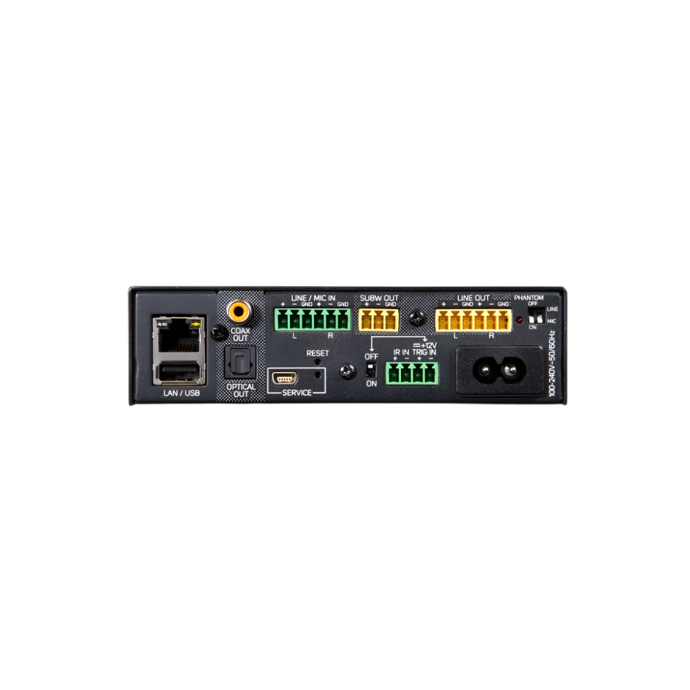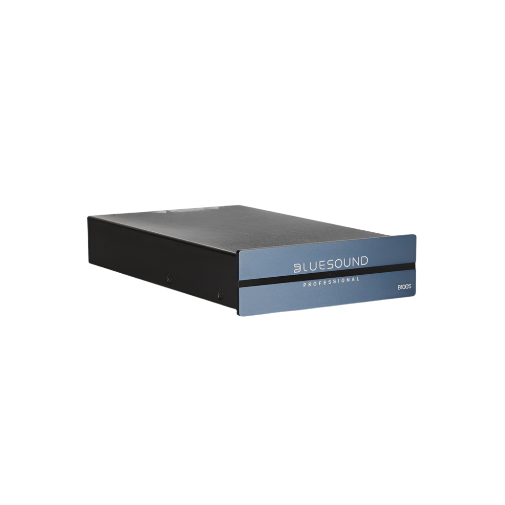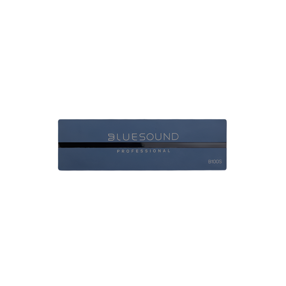 The Bluesound Professional B100S is a 1/3 rack space network music player designed specifically for use in commercial installations. This player is based on the established BluOS platform and is capable of playing and distributing content from local network storage as well as from a large number of streaming services, including some specifically designed for commercial use, such as SoundMachine, Custom Channels, QSIC, SiriusXM Music for Business and Tunify.