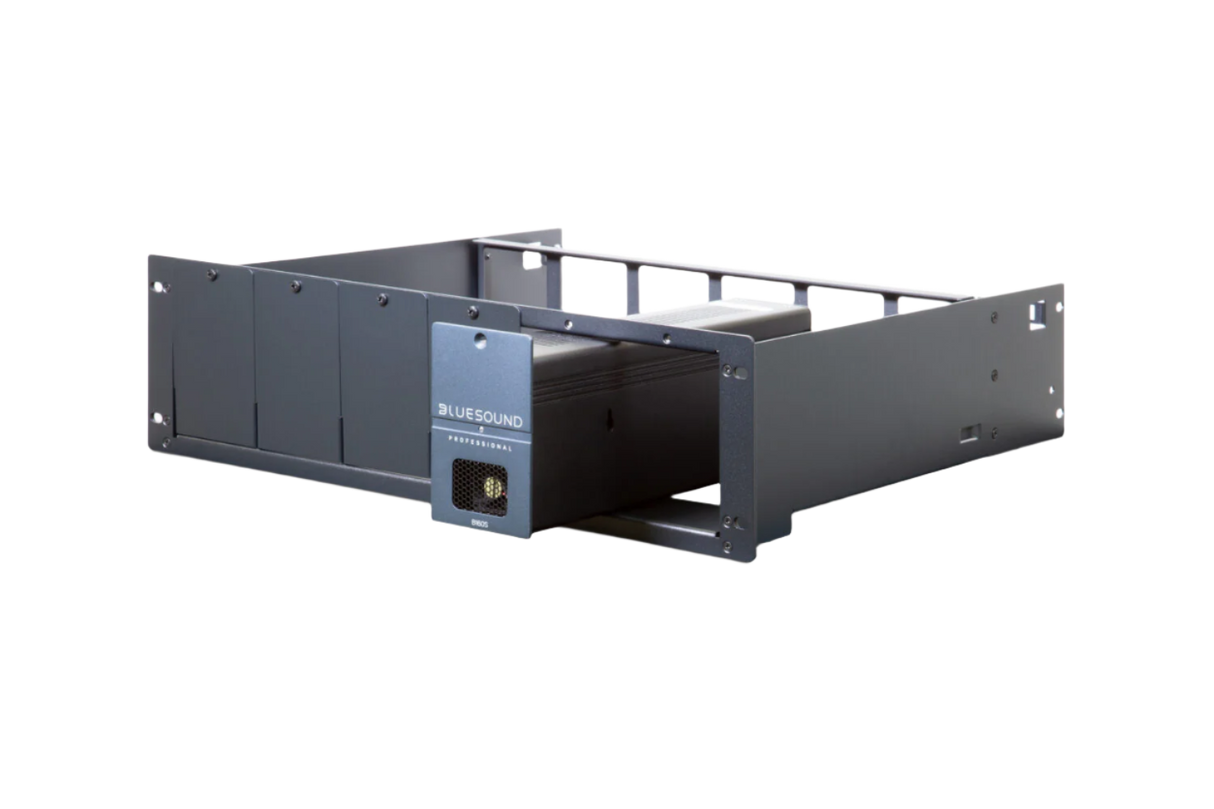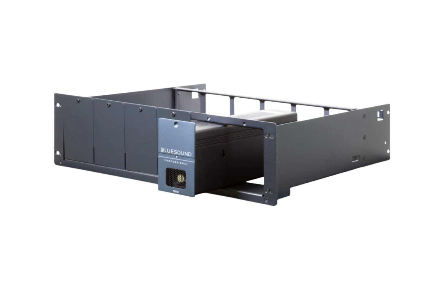 The Bluesound Professional RM160 is a rackmount system allowing up to 6 x B160S network streaming stereo amplifiers to be mounted in a 3U space in a 19” rack. The B160 modules slot in from the front and are secured by a front panel screw, allowing for swift replacement when required. B160S units are supported front and back and cabling is tidied with a rear tray.
