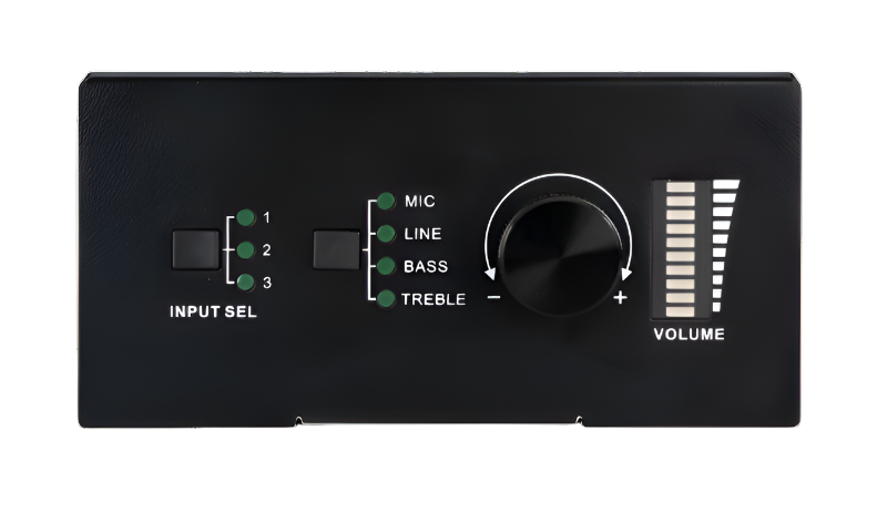 The Pulse Audio PAV1100 is a 100 Watt Class-D power amplifier with output alternatively at 70V or 100V. Featuring stereo inputs (a 3.5mm jack for line in and two RCA for L&R audio), one digital input and a balanced MIC input. Also features mic ducking functionality, EQ control, and mic mixing.