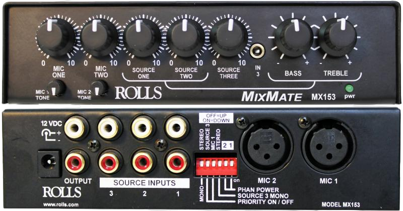 The MX153 is a compact two microphone and three stereo source mixer designed mainly for installation purposes. It's ideal for small restaurants, clubs, churches, schools, or any application where two paging or announcing microphones need to be mixed with stereo sources such as AM/FM tuners, CD players, juke boxes, and video players. Priority talkover is provided on Microphone One for paging, and on Source Three for a jukebox, telephone, etc.