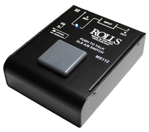 The MS112 is an XLR switching device. The MS112 will allow you to Push To Talk or mute an XLR signal with a selectable momentary or latching switch configuration. LED indicator for monitoring where the XLR signal is being sent. A mic or line level XLR is plugged into the input, and output is sent to the A or B outputs in a momentary or latching configuration. Quiet switching for both +48V phantom power microphones or dynamic microphones.