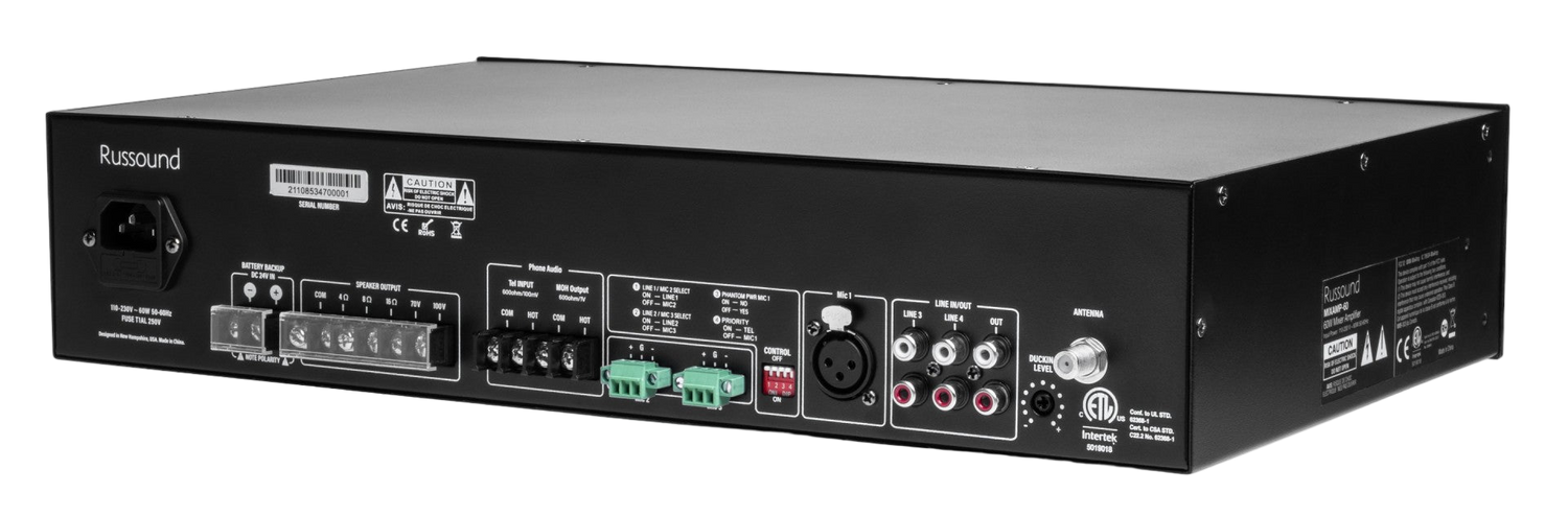 and SD card MP3 player. Convenient front panel controls allow for precise volume level of all connected sources as well as an integrated LCD display showing currently selected audio from the built-in sources. Background Music (BGM) and Music On Hold (MOH) integration are available as well as a Telephone Paging Input. Phantom Power is available for the primary microphone as well as adjustable ducking levels.