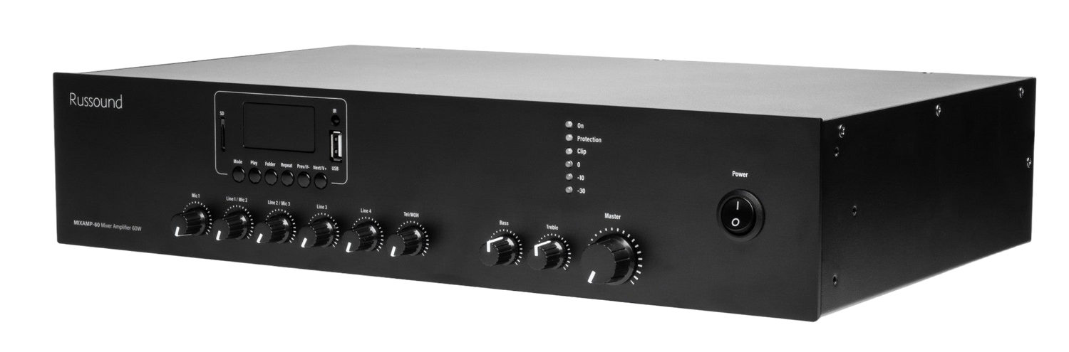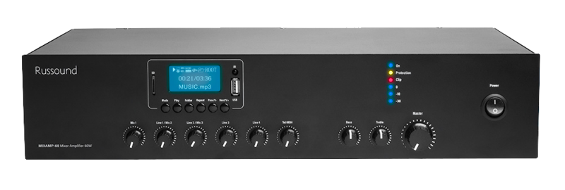 The MIXAMP-60 Mixer Amplifier with MP3, FM tuner & Bluetooth, is ideal for schools, supermarkets, convenience stores, banks, retail stores and similar environments. It is an all-in-one solution with built-in audio sources, pre-amp mixing, audio amplification, expandability to external sources, microphones, etc., in one small, rack-mountable chassis.