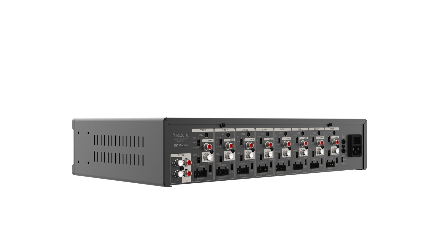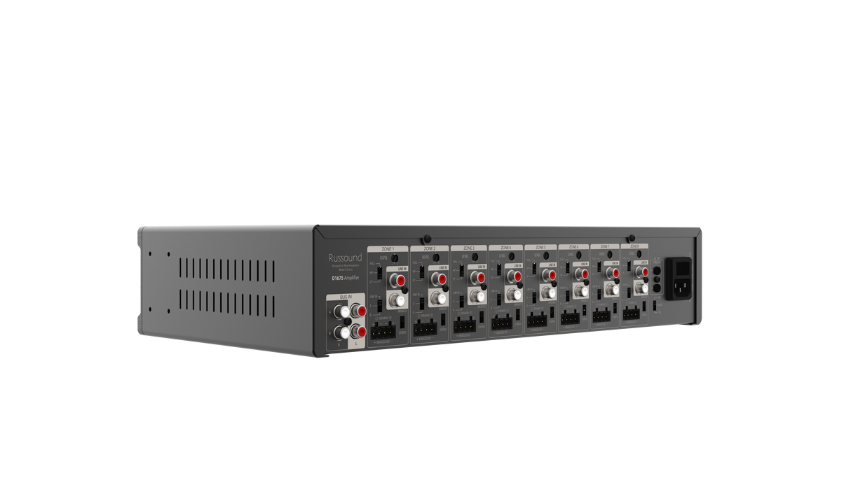 The D1675 delivers a powerful 75 watts per channel, divided into 8 zones.  Each zone can select from either of the two available bus inputs or use its dedicated zone input.  Additionally, each zone can be bridged to provide up to 150 watts, perfect for outdoor speakers or in larger rooms where higher sound levels are required.