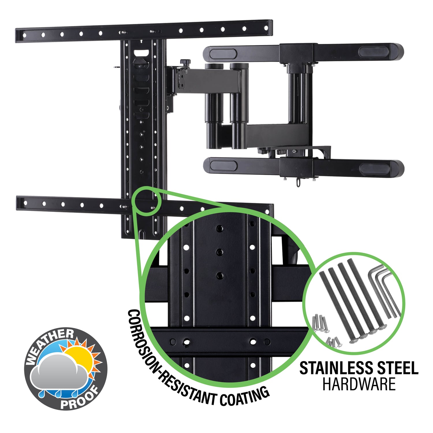 Introducing the Outdoor Premium Full-Motion TV Mount - Designed to handle the elements, this weatherproof mount is built with a corrosion-resistant coating and stainless-steel hardware for durability. 25-inches of extension offers flexible cable access, and the perfect viewing angle so you get the best seat wherever you are. Motion lock knobs keep your TV securely in place to prevent unwanted movement. With Virtual Axis(TM) fingertip tilt technology, you can tilt and swivel your TV to reduce glare and improve the viewing angle. The slim profile of this mount blends seamlessly into your décor, placing your TV just 2.74 inches from the wall for a sleek and stylish look. Upgrade your outdoor entertainment space with the perfect mount. For TVs 40"-85"