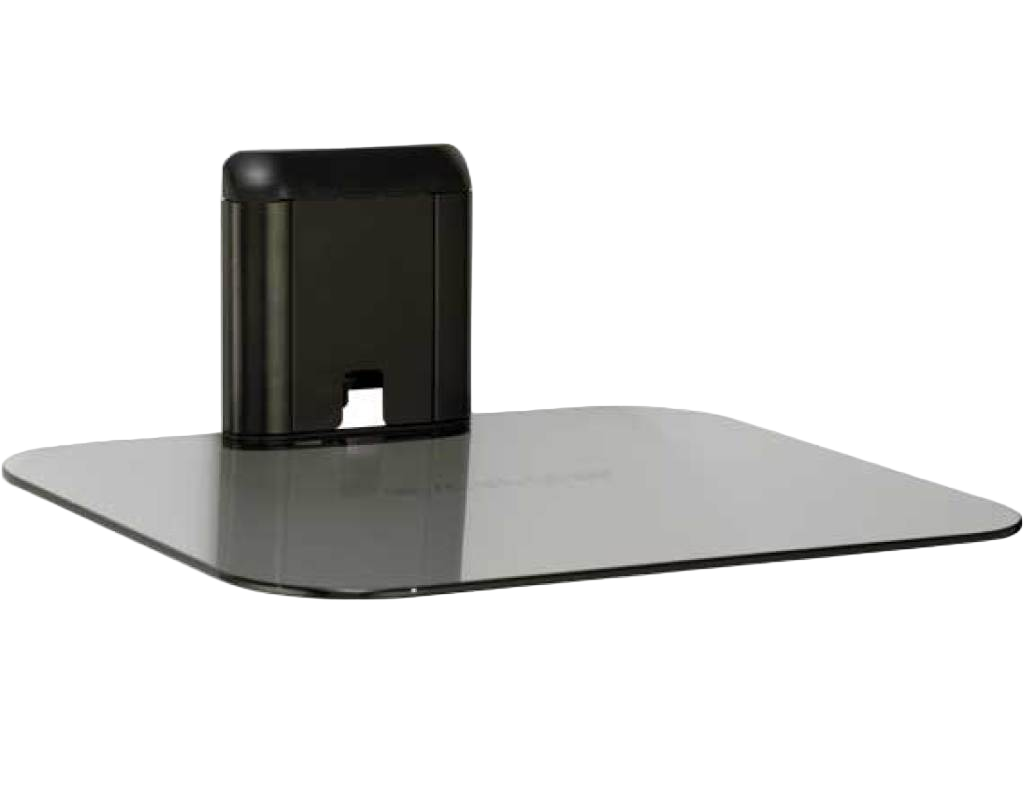 The SANUS Vertical Series VMA401 is a single-column AV component shelf that mounts directly under wall-mounted TVs for a sleek, streamlined look. Its center column is vertically adjustable for perfect alignment under a wall-mounted TV, even after hanging. The center column features an integrated channel for easy power cable and signal wire routing. Combine more than one VMA401 for a multiple shelving unit.