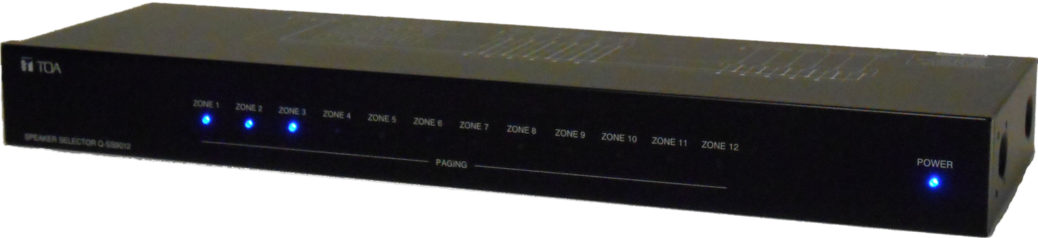 The Q-SS9012PS Multi-Zone Speaker Selector has 2 amplifier inputs and 12 individual relay switches to select the amplifier connected to each 12-speaker line/zone. This allows up to 12 zones for paging and BGM distribution with a dual channel amplifier or simple paging system with only a one channel amplifier. TOA's new concept offers a real cost-effective multi-zone paging system.