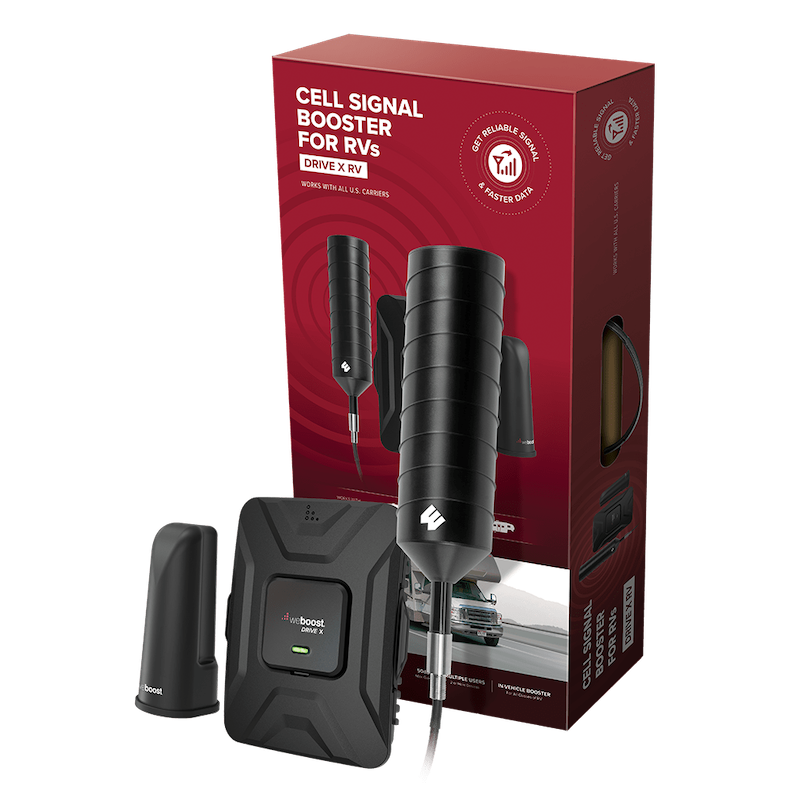 Drive X RV is our standard multi-user, in-vehicle cell signal booster for all classes of RV. It’s designed to reach cell towers at distances up to 33% farther than the weBoost Drive Sleek.