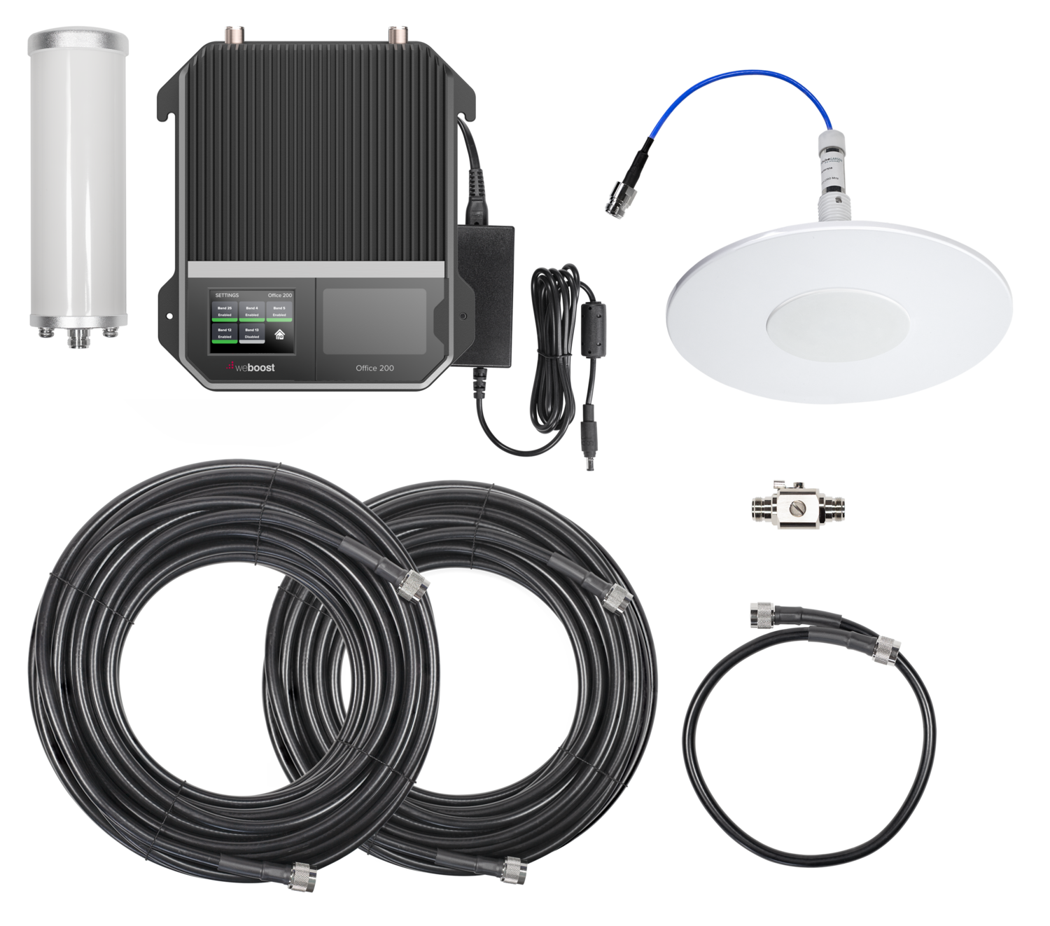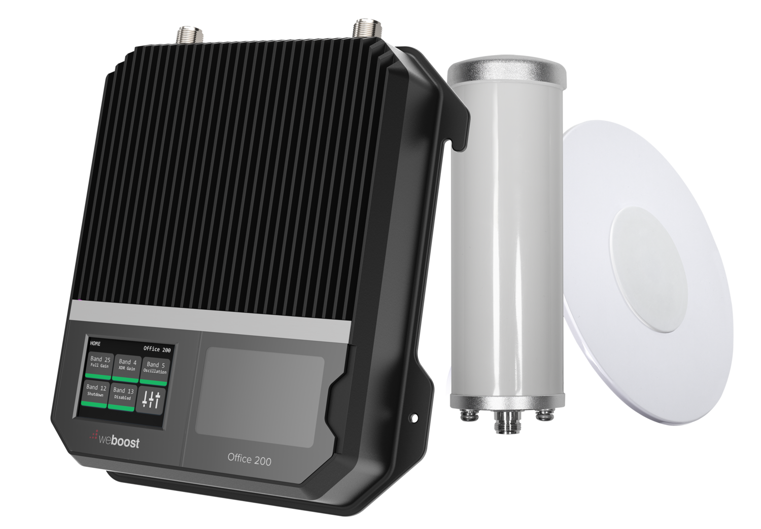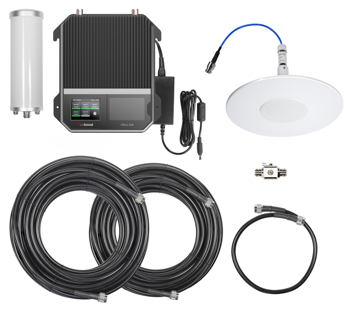 weBoost Office 200 is perfect for small to medium-sized businesses and warehouses looking for a high-performance amplifier solution to improve cell signal in a commercial space. Office 200 comes with a color LCD touch screen, allowing users to troubleshoot, assess performance, adjust the outside antenna, and turn bands on and off. All components needed for do-it yourself installation are included. Office 200 is 5G compatible and improves cell signal on all U.S. carrier networks, including Verizon, AT&T, Sprint, T-Mobile, US Cellular and more. Office 200 comes with an industry-leading 3-year manufacturer's warranty and a 30-day money-back guarantee.