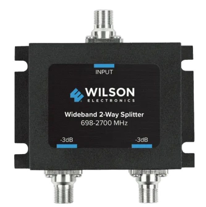 The Wilson 850034 Two-Way 700-2500 MHz 75 Ohm Splitter with F Female Connectors is used to split a single input signal into two outputs.